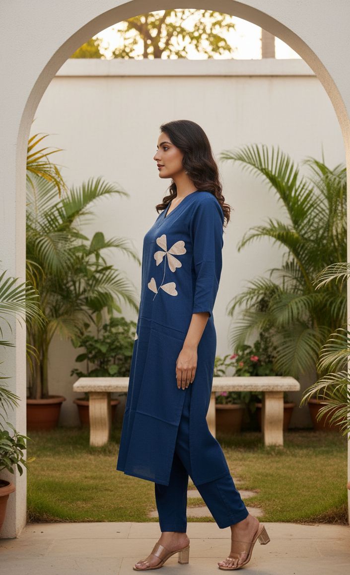 Blue Color Cotton Kurta with Flower Patch Work & Pant Set