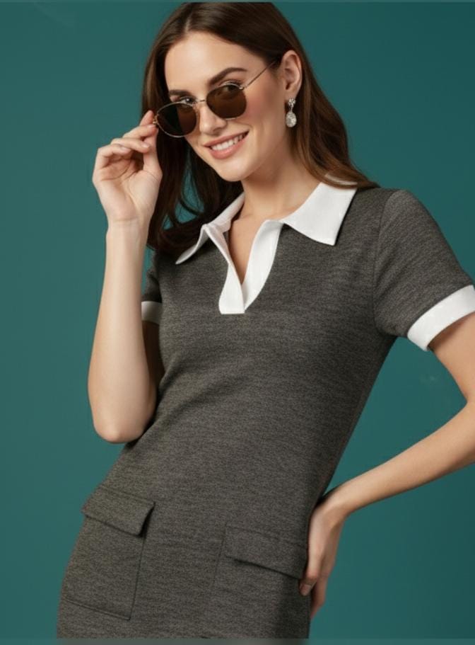 This stylish grey polo collar T-shirt dress. Designed with a flattering bodycon silhouette, this dress combines comfort with modern style. The soft stretchable fabric ensures a perfect fit, while the contrasting white collar and sleeve edges give it a smart, polished look. Featuring subtle pocket flap detailing and a knee-length cut, this dress is perfect for women who want a blend of casual comfort and chic elegance.