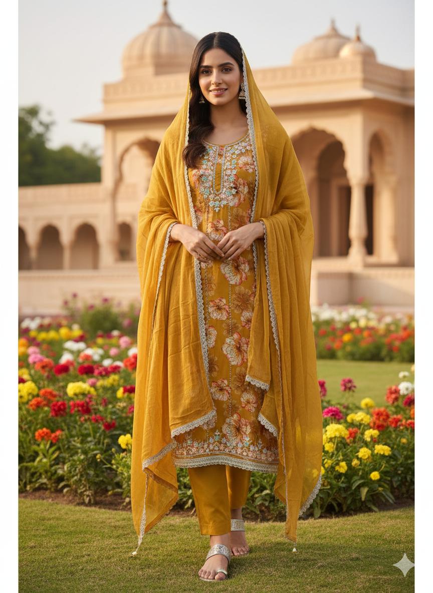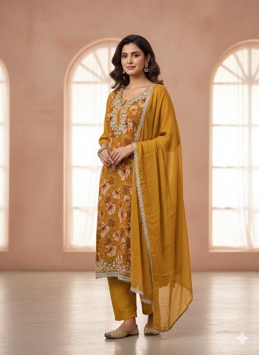 Bring effortless elegance to your wardrobe with this stunning mustard yellow crepe ethnic set, featuring vibrant floral digital prints enhanced with delicate handwork detailing. Crafted from soft, flowy crepe fabric, this set offers a graceful silhouette with all-day comfort. Paired with a matching dupatta, it’s a perfect blend of traditional charm and modern style.