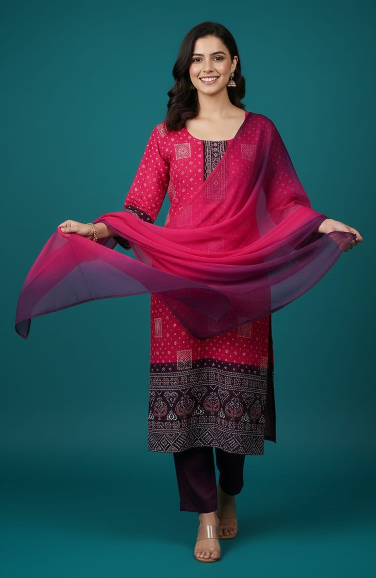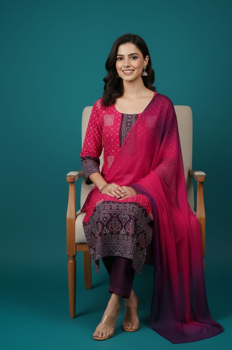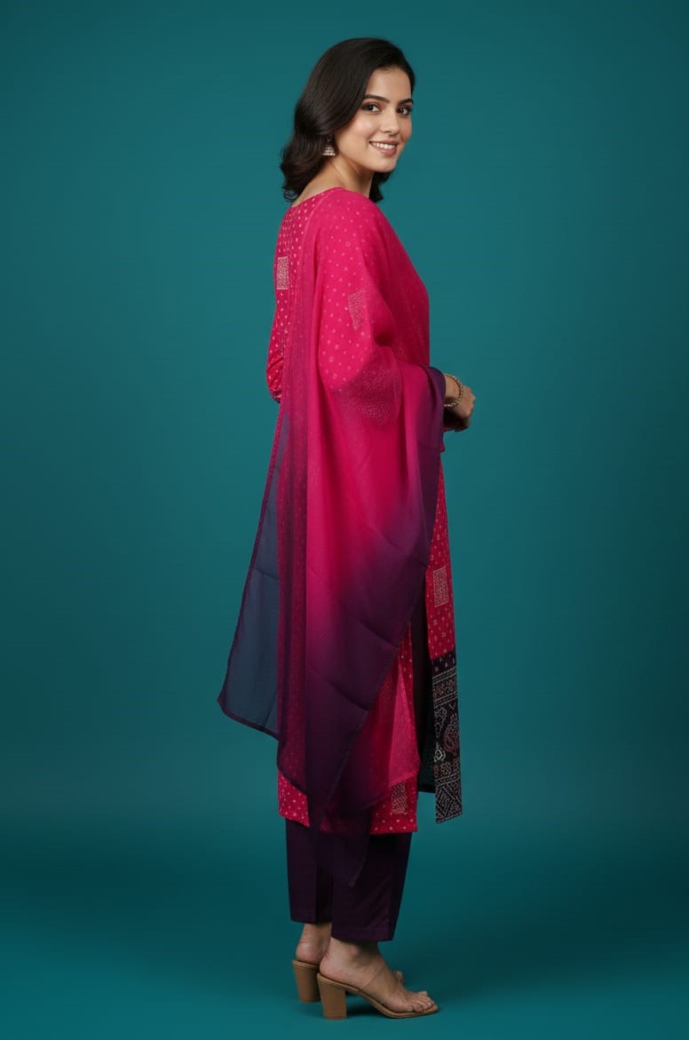 Add a touch of traditional charm to your wardrobe with this beautiful pink cotton ethnic set featuring classic Bandhej-inspired prints and fine thread work detailing on the neckline. Crafted from soft, breathable cotton, this outfit ensures all-day comfort while offering a graceful ethnic look. Paired with a matching dupatta, it’s perfect for effortless styling.