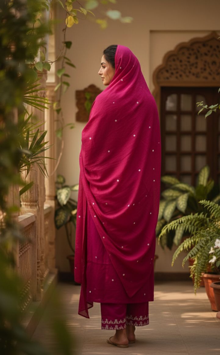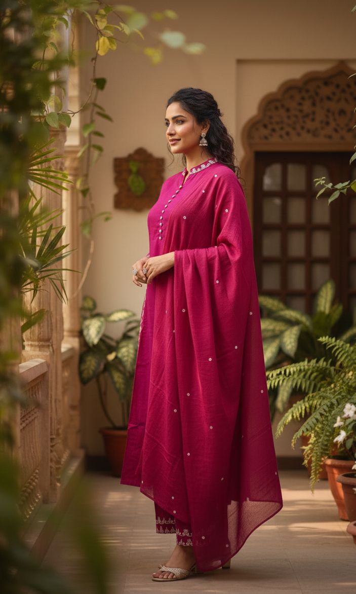 Add a vibrant touch to your ethnic collection with this stunning magenta cotton suit set, beautifully enhanced with subtle thread work detailing. Crafted from soft and breathable cotton, this outfit ensures all-day comfort while maintaining a graceful and refined look. Paired with a matching dupatta, it’s a perfect blend of simplicity and elegance for every occasion.