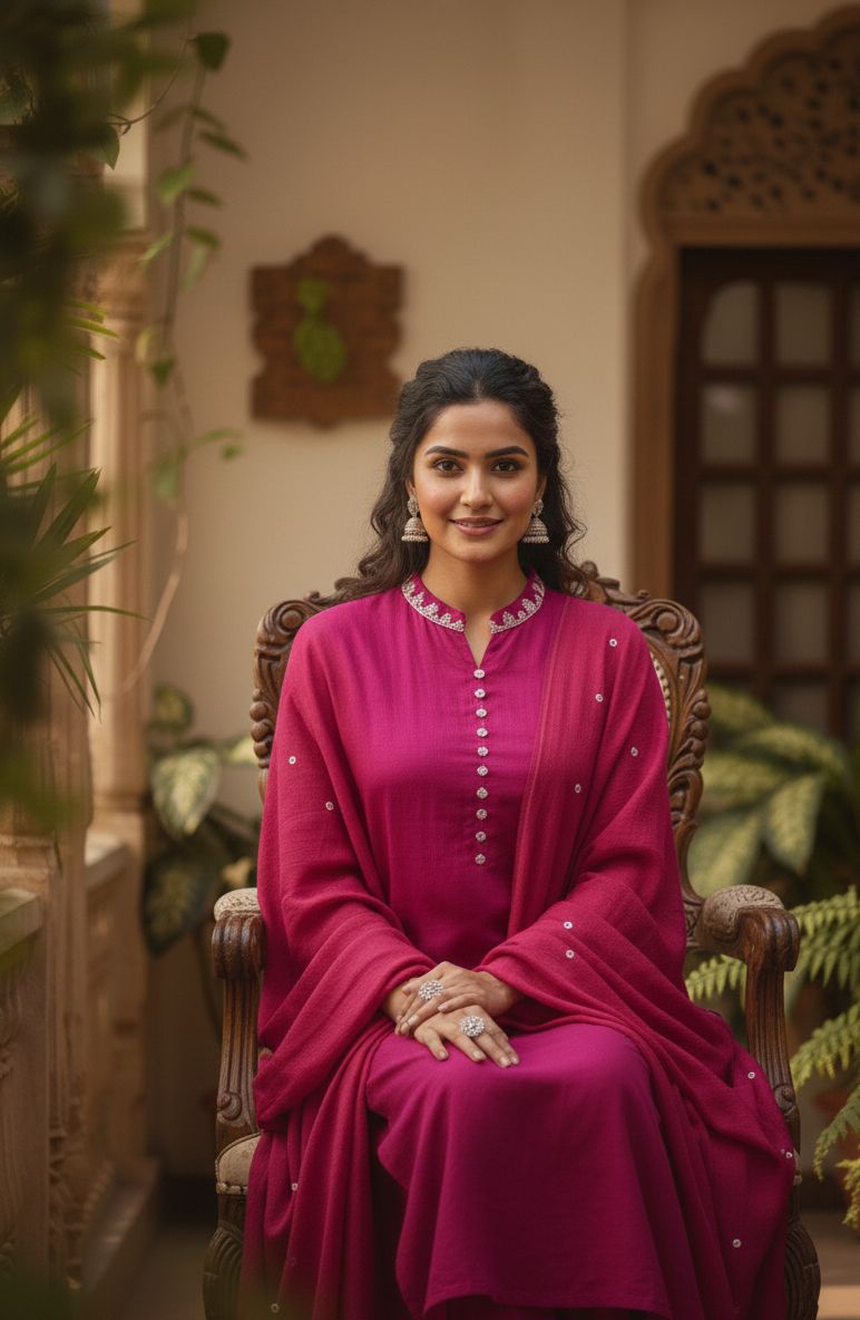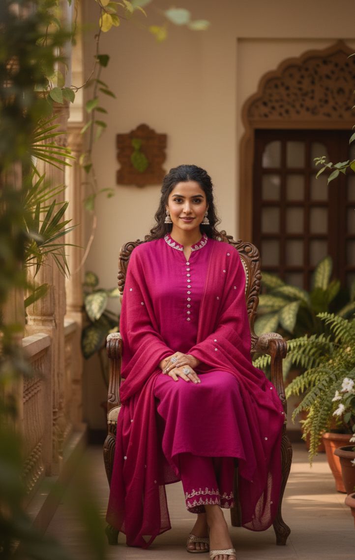 Elegant Magenta Cotton Ethnic Set with Thread Work Detailing | Women’s Kurta Pant Dupatta Set for Festive, Office & Daily Wear