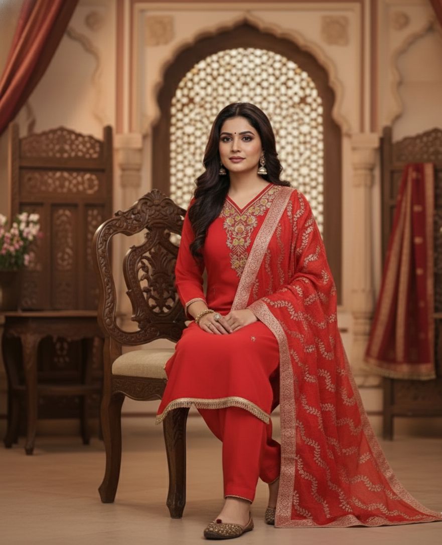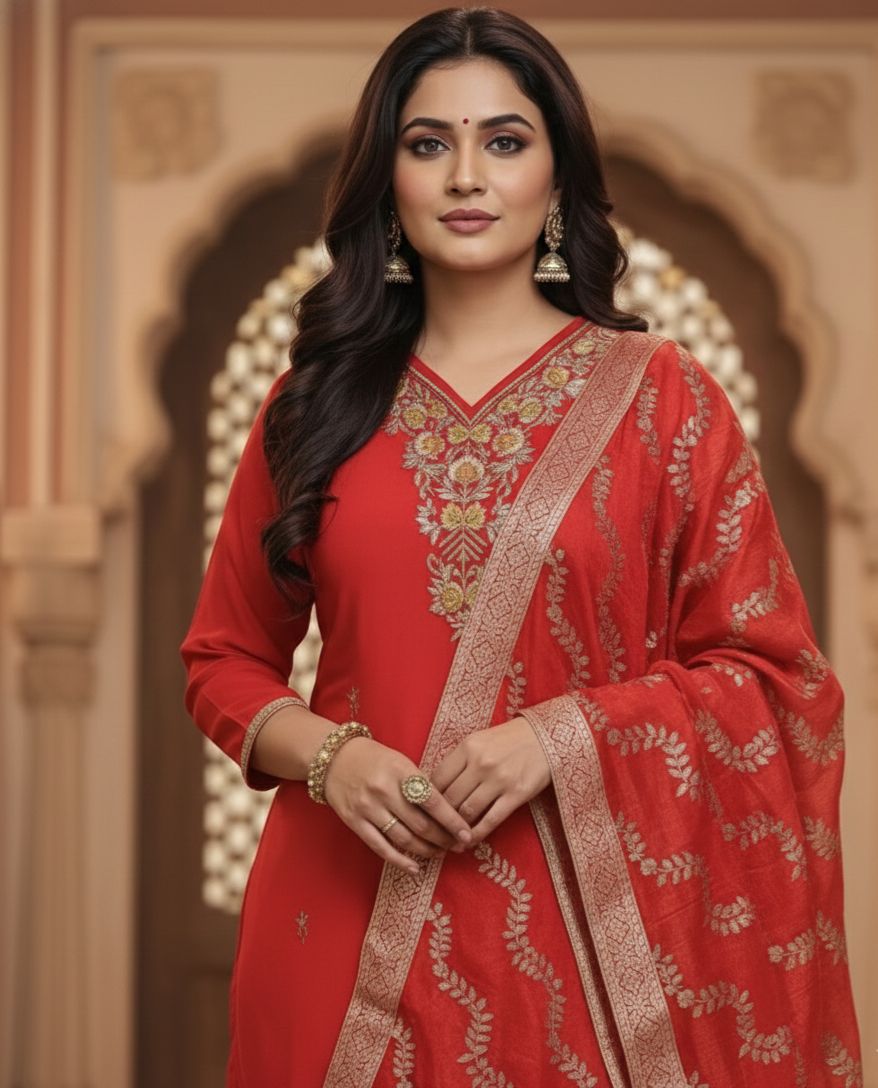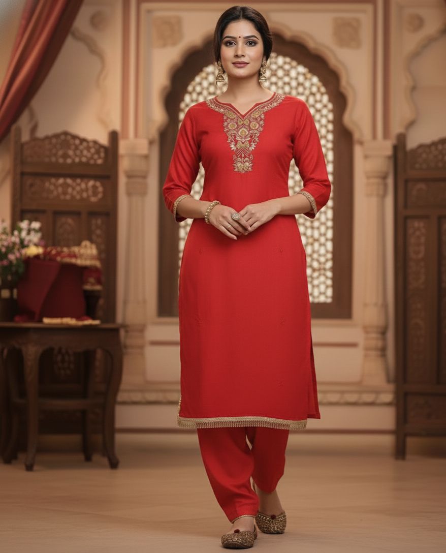 This Red crepe silk ethnic set, crafted to bring elegance and festive charm to your wardrobe. Designed in luxurious crepe silk fabric, the kurta features intricate heavy handwork on the yoke, adding rich detail and a refined finish.