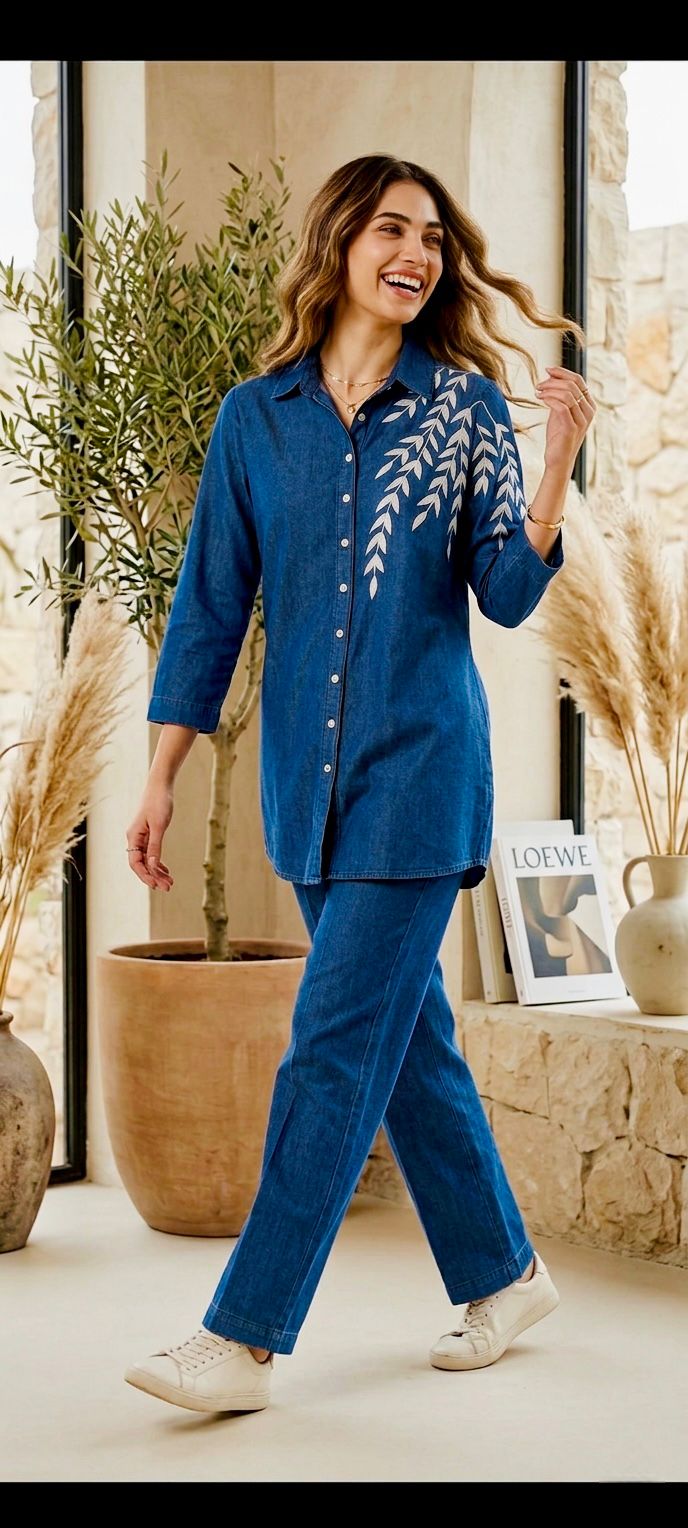 Elegant Indigo Denim Cotton Co-ord Set with Thread Embroidery Work | Stylish Shirt Top Pant Set for Women