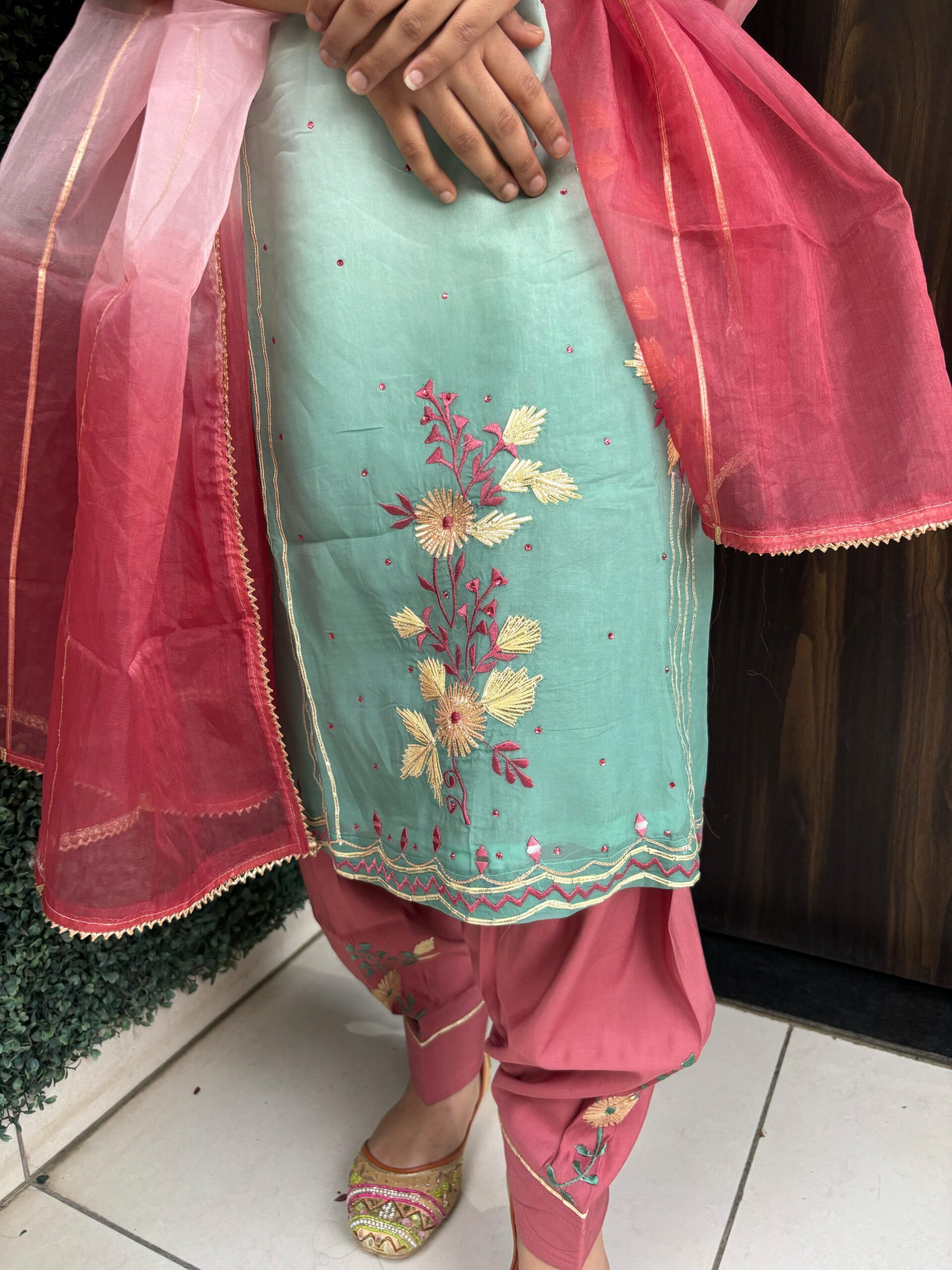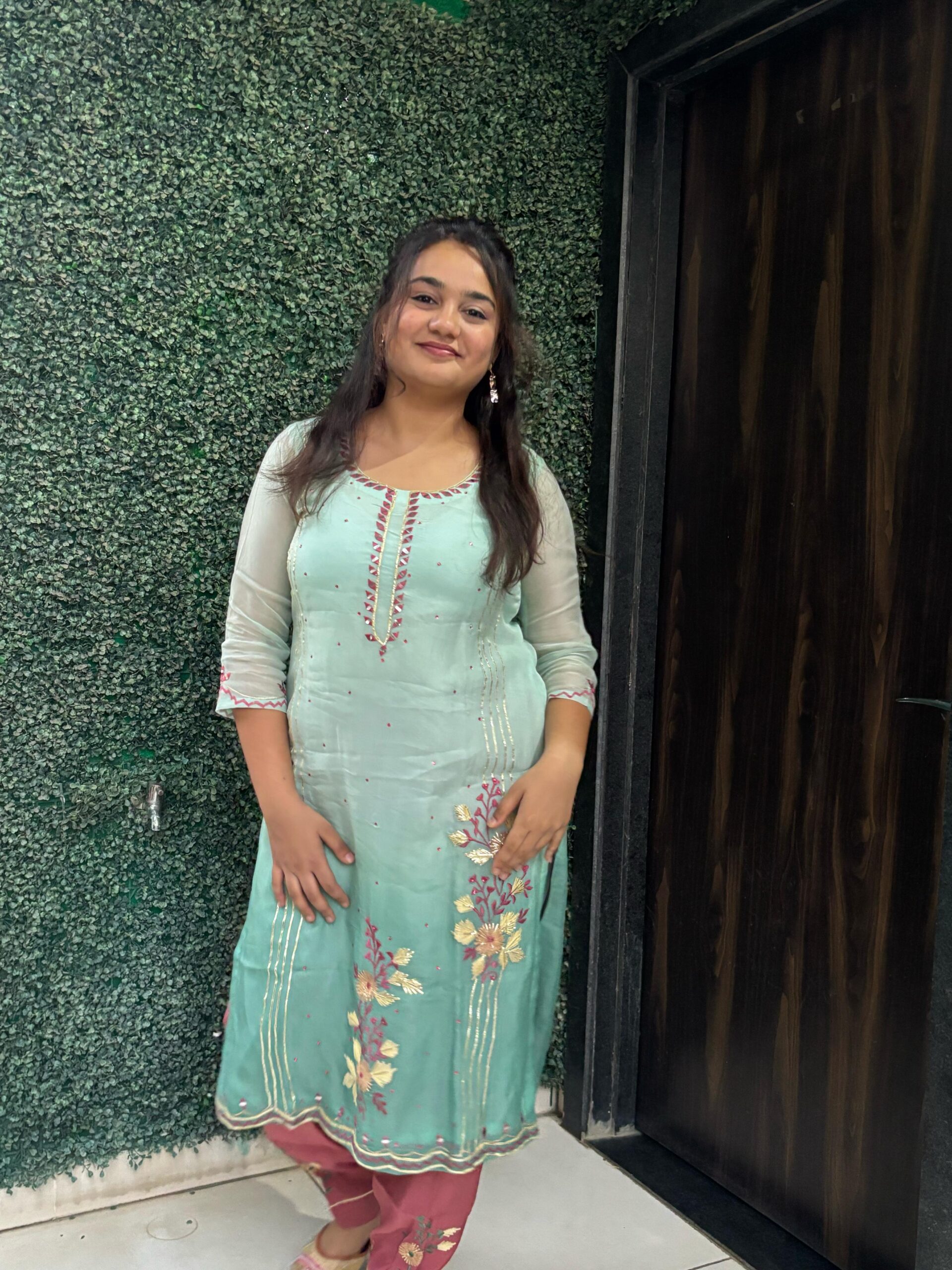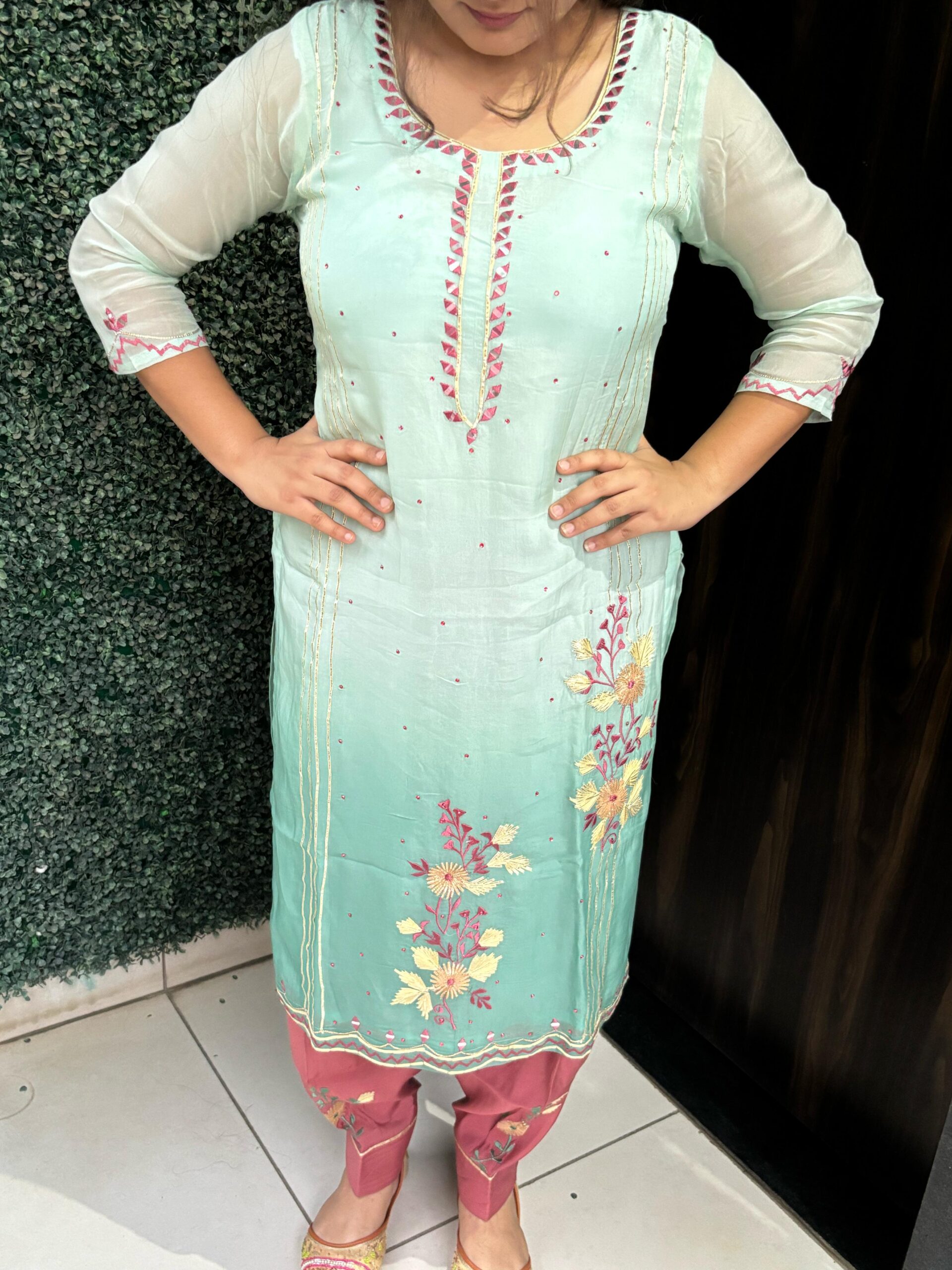 Article Details: Kurta : Pure Organza fabric with elegant all over handwork and resham work and cotton mul full lining attached. Bottom : Silk fabric Pant with work on hem and full lining attached. Dupatta : Organza fabric with lace work. Note: dry-cleaning will be required because of handwork.(Out Of Stock) -