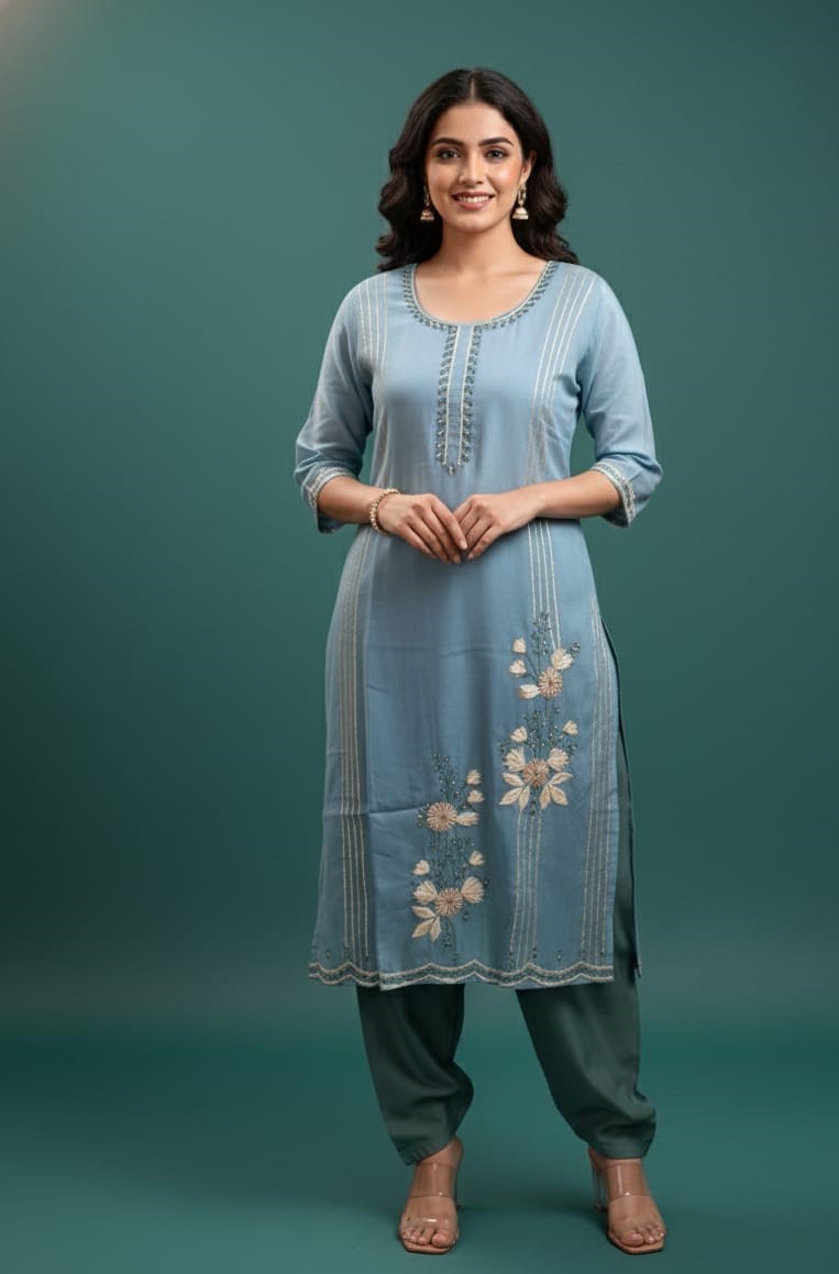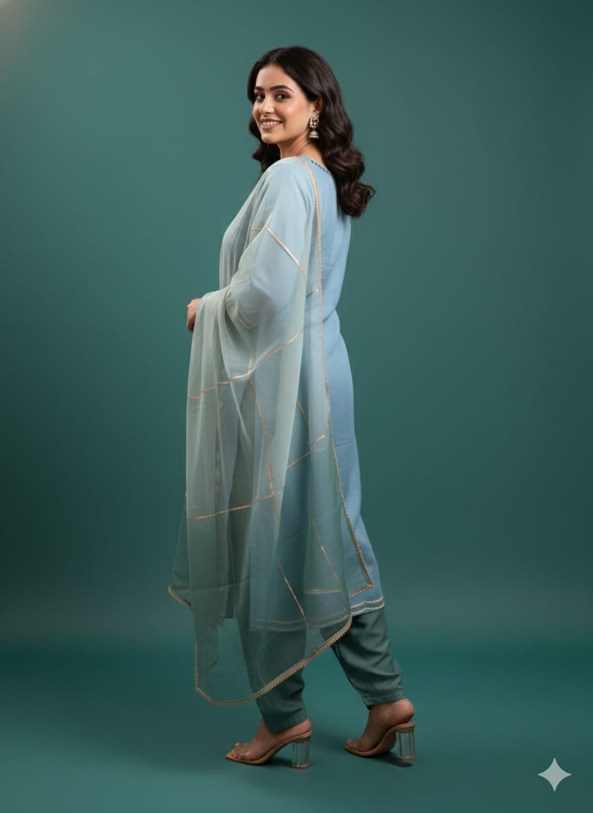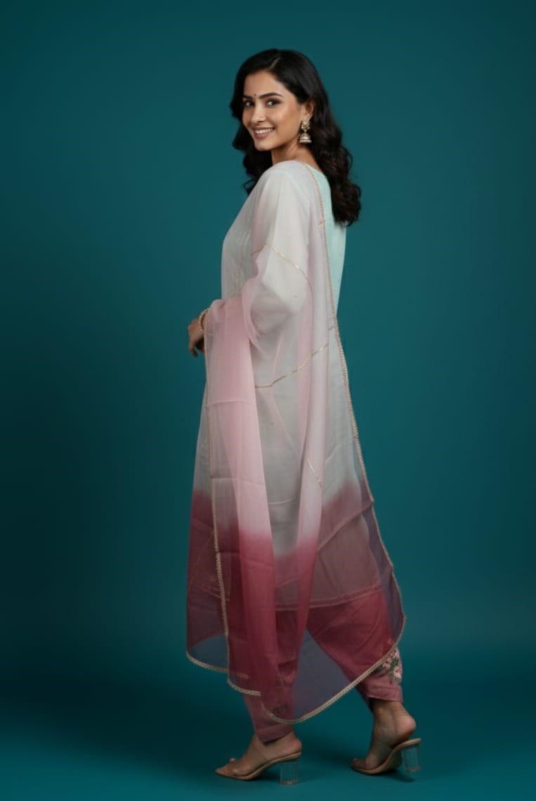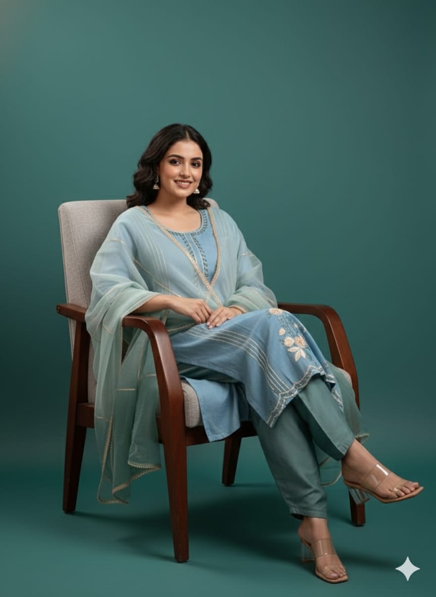 This Women’s Organza Gotta Patti Ethnic Suit Set, crafted in lightweight sheer organza fabric for a graceful festive look. Featuring delicate gotta detailing on the neckline and subtle floral accents, this beautifully coordinated kurta set comes with a matching bottom and soft organza dupatta. Designed for comfort and sophistication, it’s the perfect blend of traditional charm and modern style.