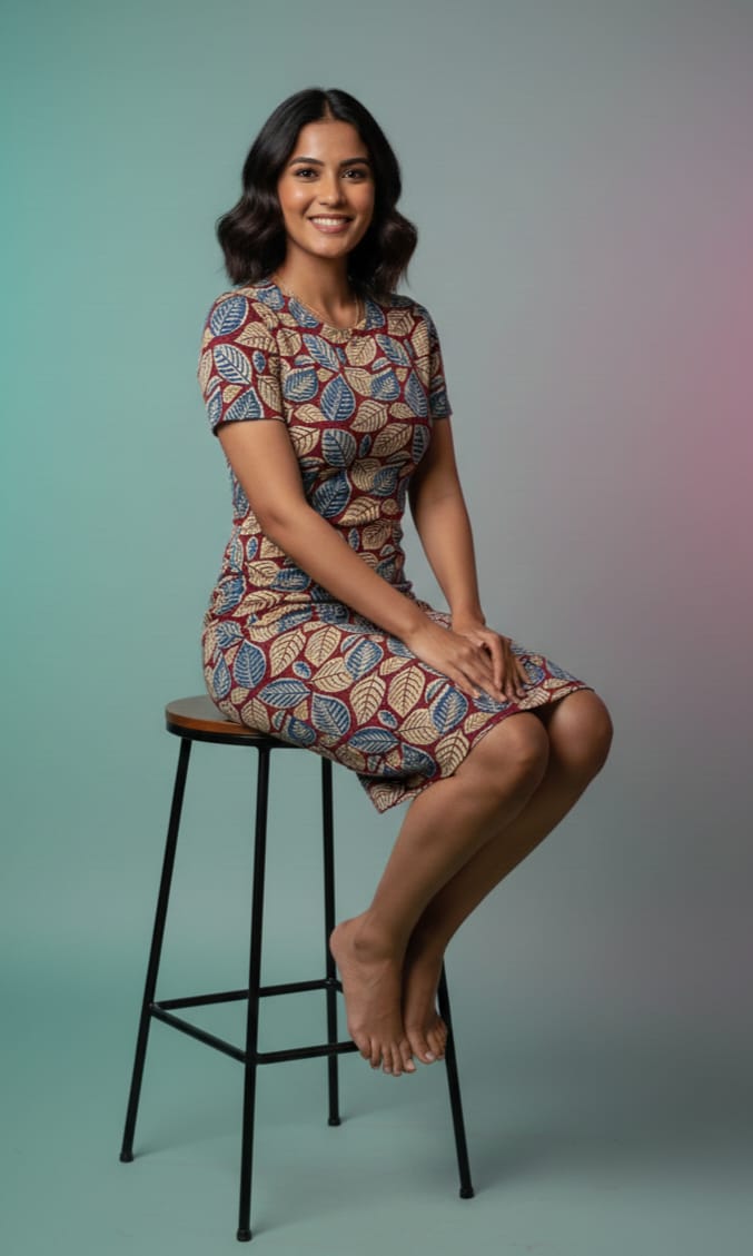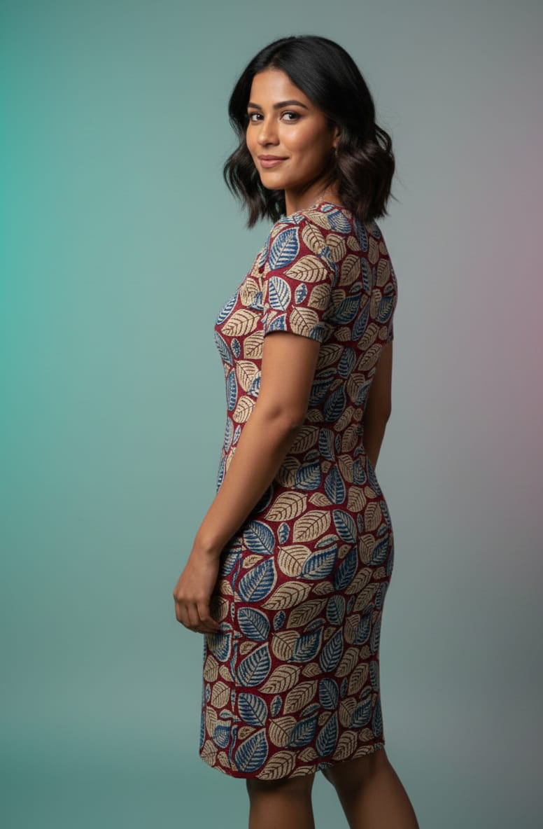 Add a touch of traditional charm to your modern wardrobe with this stylish Ikkat block print bodycon dress. Crafted from premium after-wash cotton fabric, this dress offers a soft texture, breathable comfort, and a relaxed feel perfect for all-day wear. The beautiful all-over leaf inspired Ikkat block print gives the dress an elegant ethnic vibe while maintaining a contemporary silhouette.