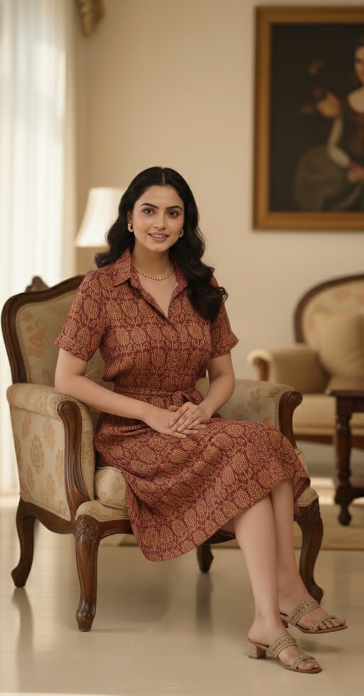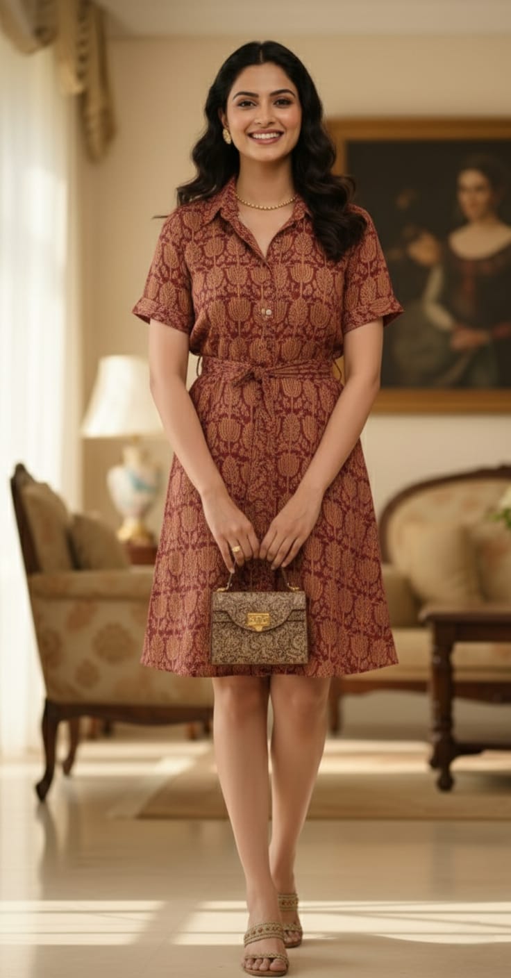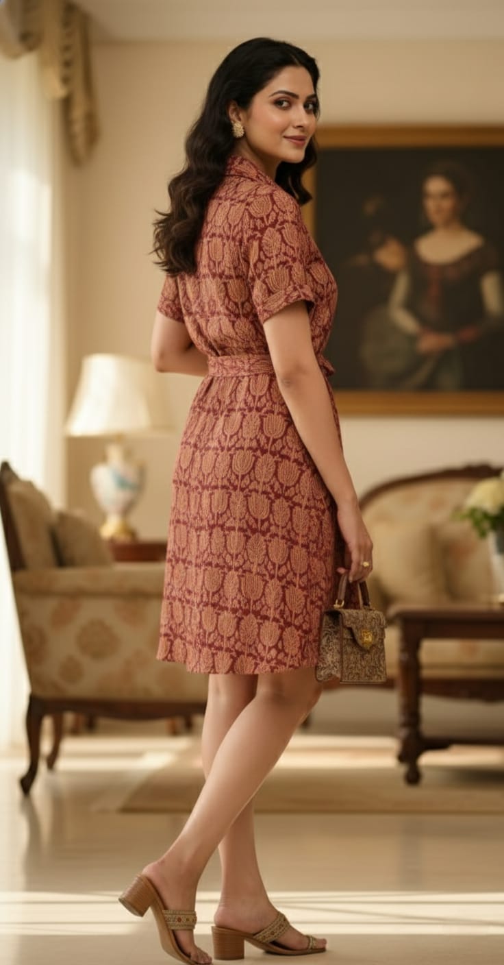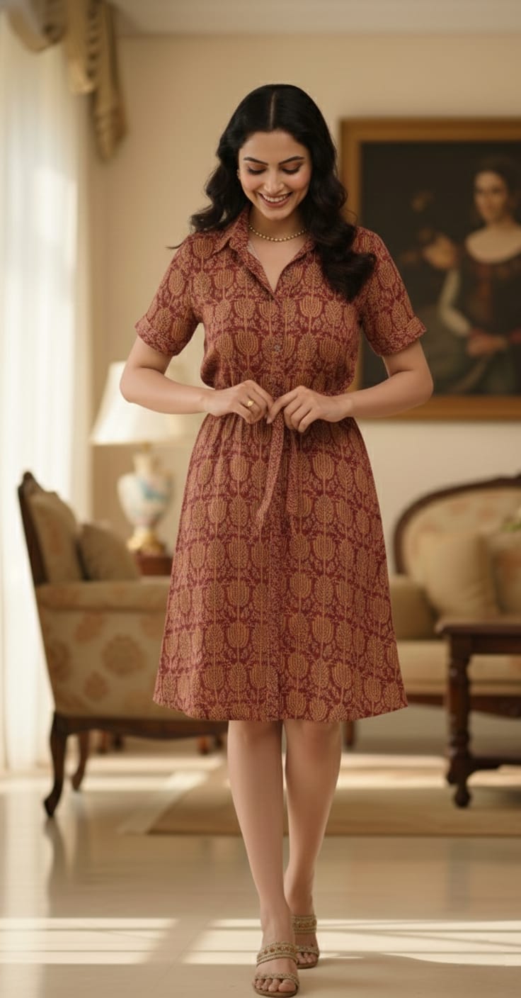 Add a touch of traditional charm to your modern wardrobe with this stylish Ikkat block print Shirt Style dress. Crafted from premium after-wash cotton fabric, this dress offers a soft texture, breathable comfort, and a relaxed feel perfect for all-day wear. The beautiful all-over leaf inspired Ikkat block print gives the dress an elegant ethnic vibe while maintaining a contemporary silhouette.