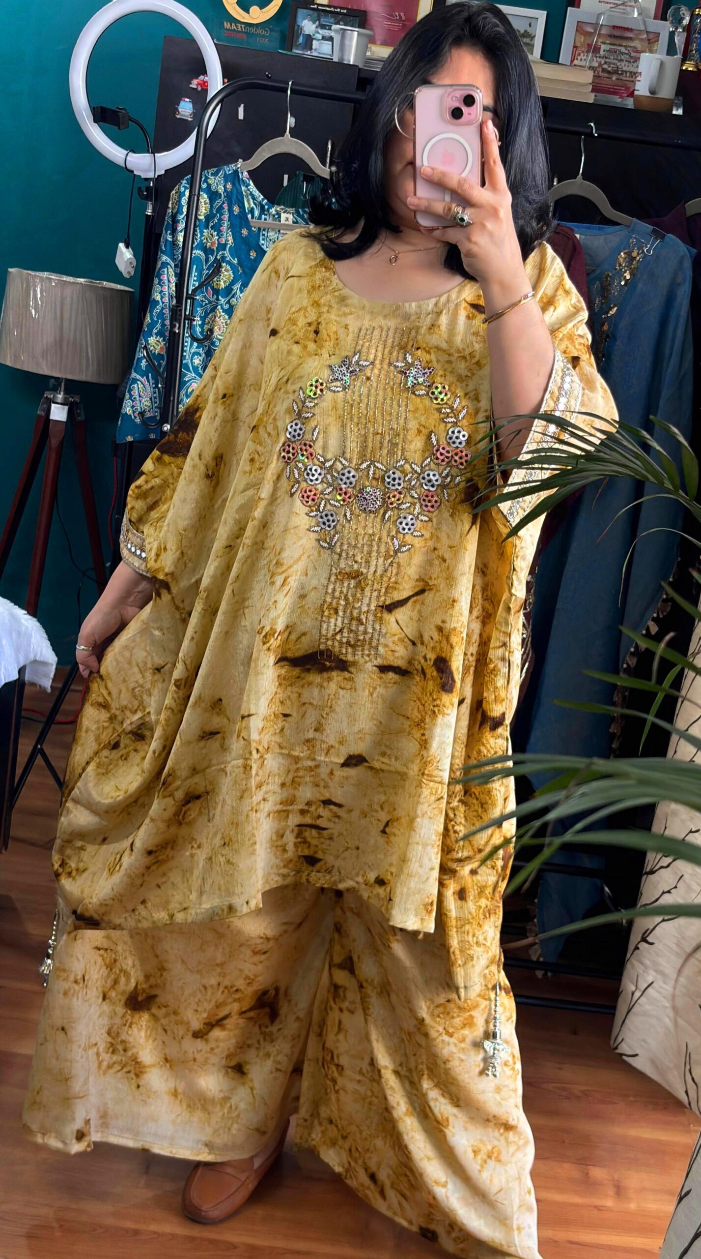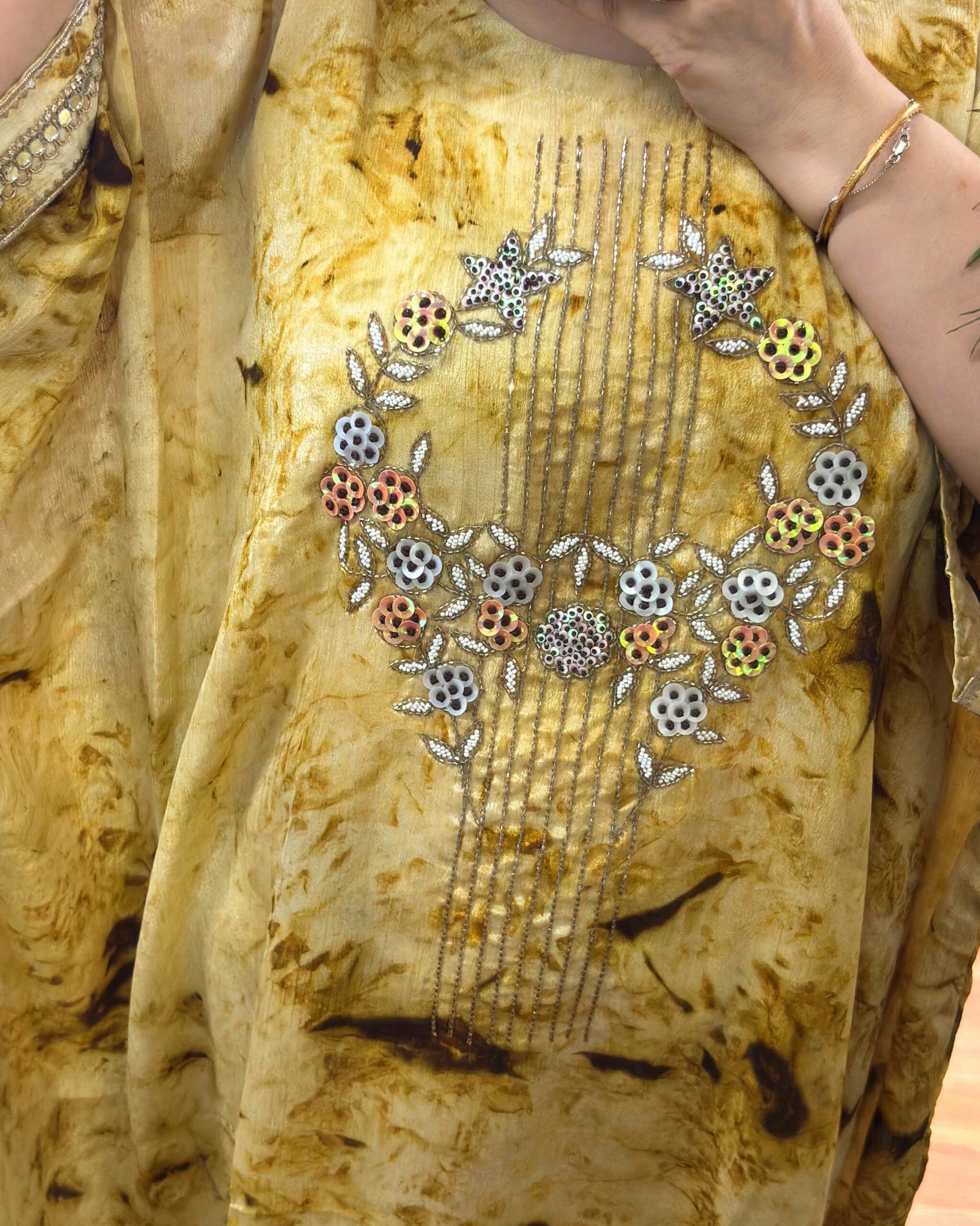 Tissue Shimmer self printed fabric designer kaftan Set Kaftan details - Kaftan Top is crafted with elegant handwork on neck front and beautiful lace work is on the edges of kaftan. Bottom - straight Pant with elastic. Perfect outfit for day & night gatherings and enlighten your wardrobe.₹1,995.00