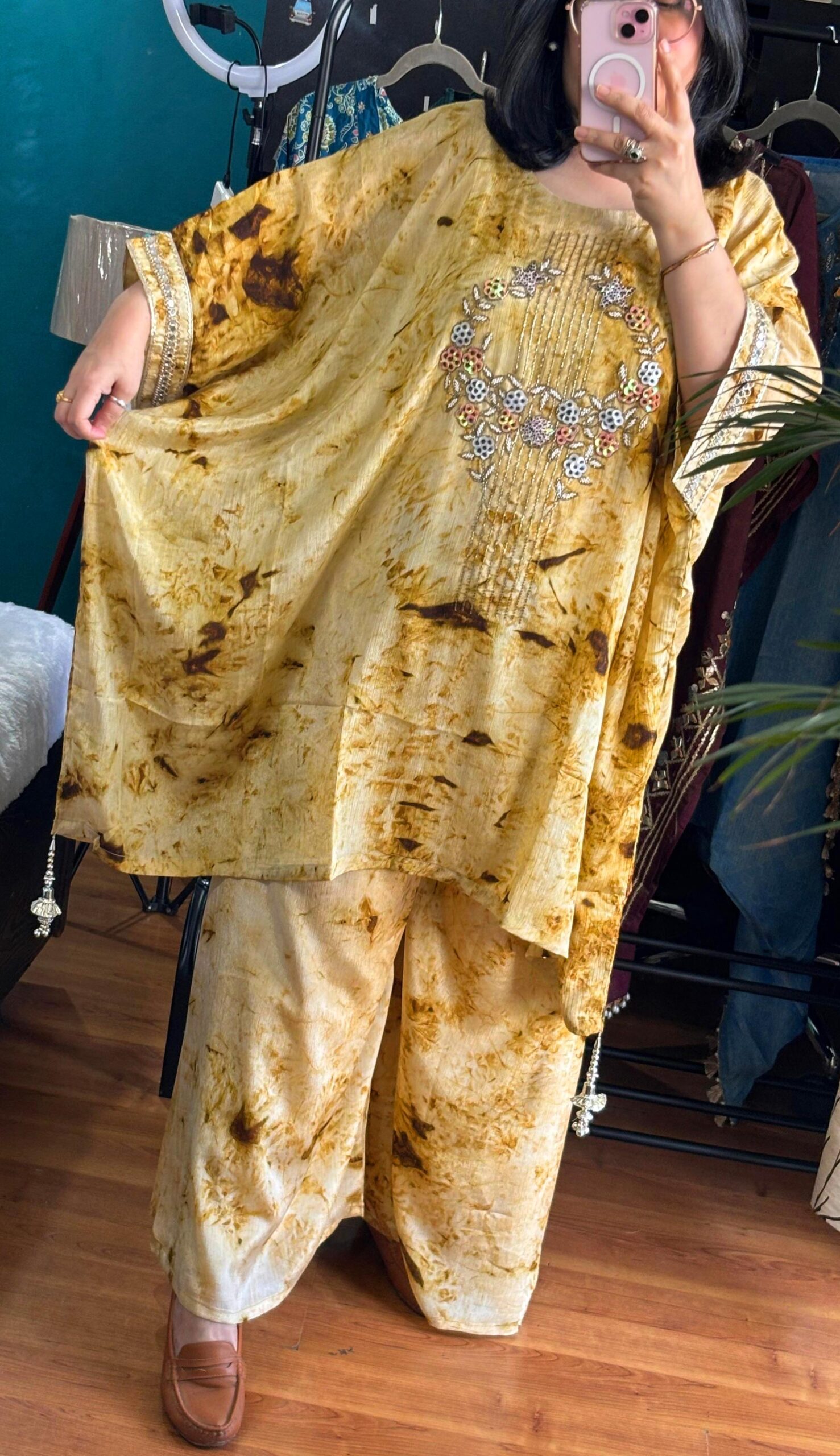 Top: Cotton blend Kaftan style with Shirt collor Top Bottom: Cotton blend Tulip Pant with lace detailing. Top highlighted with Gotta Patti leafs work.₹1,893.00 -