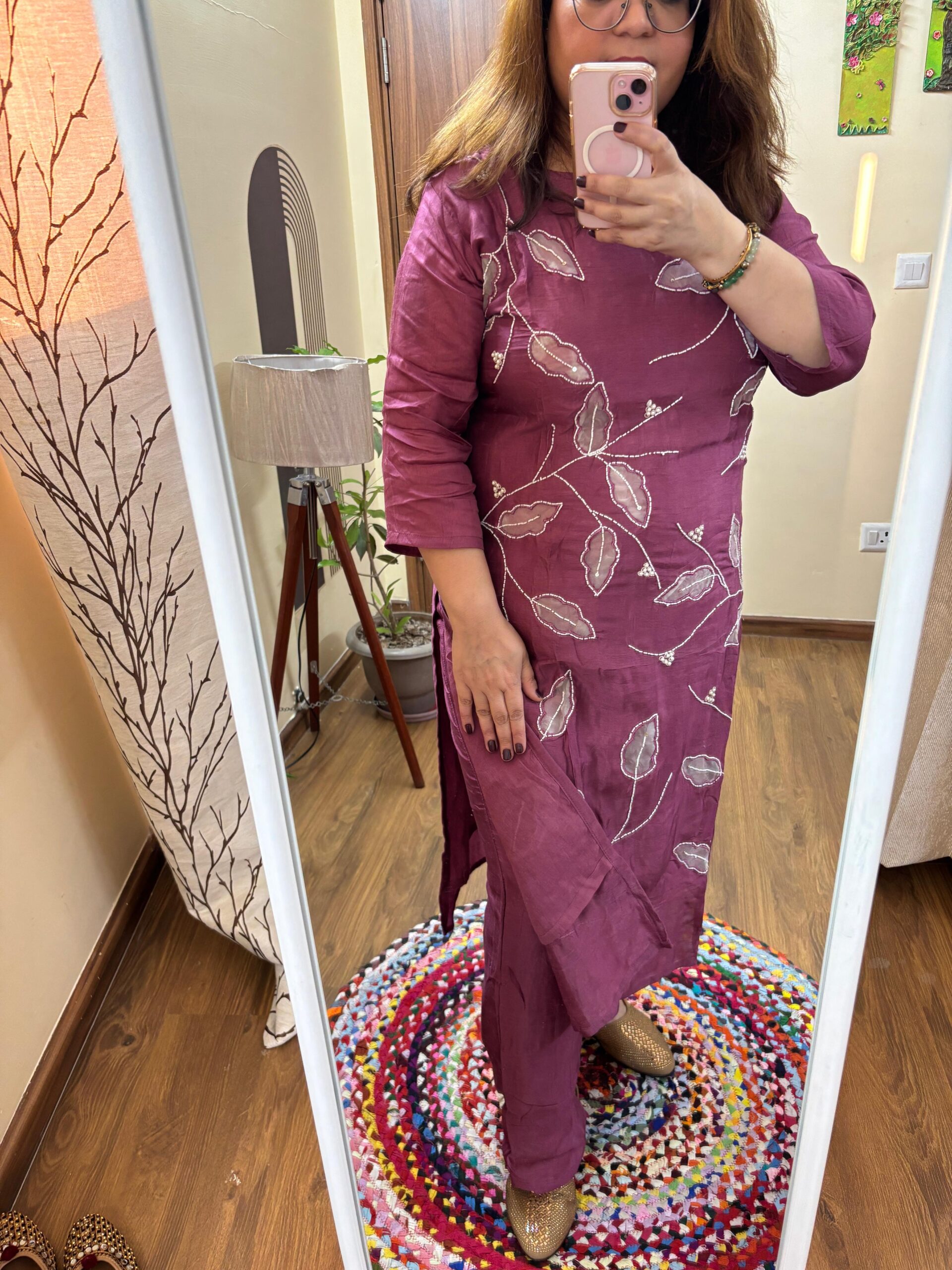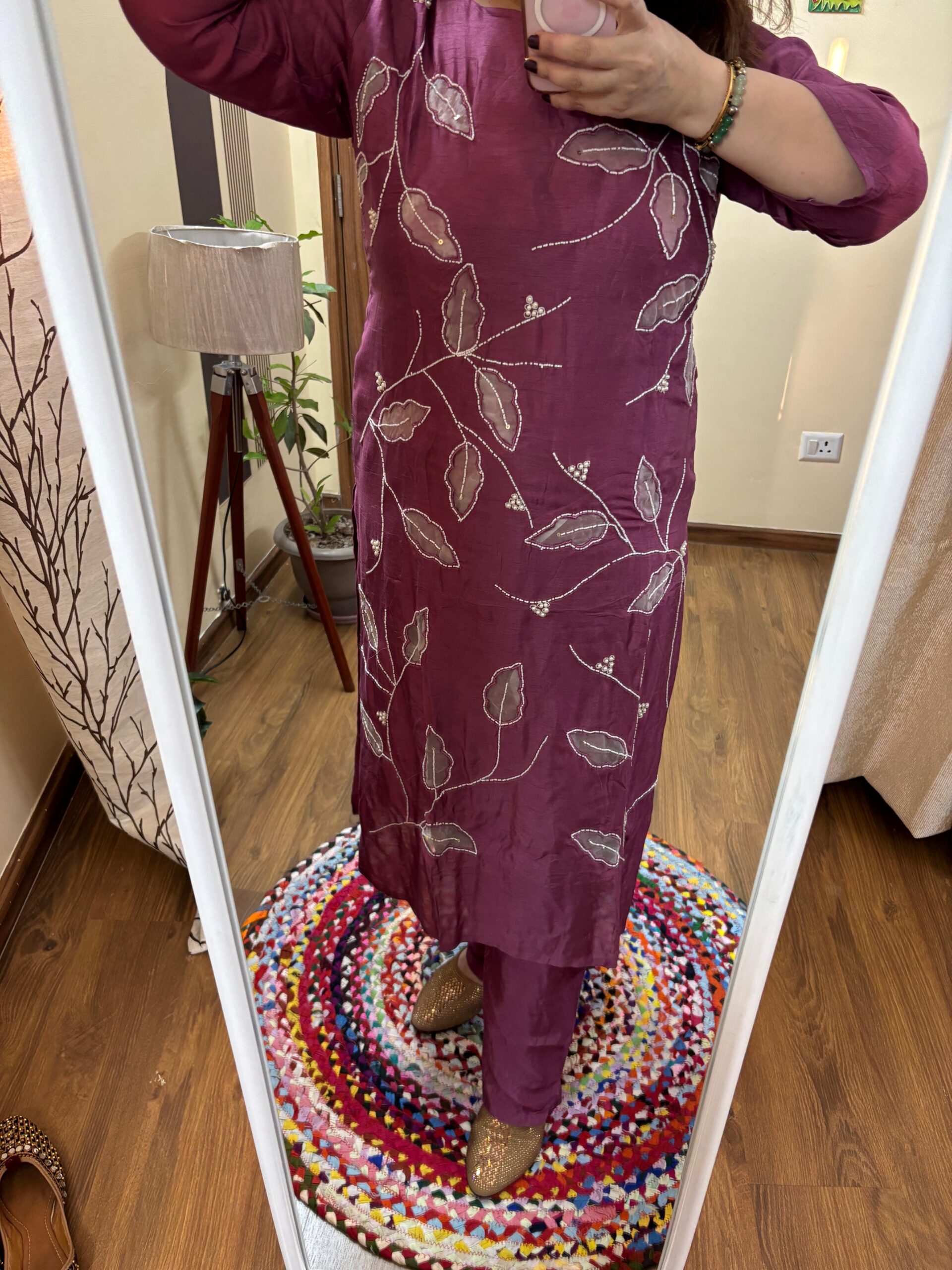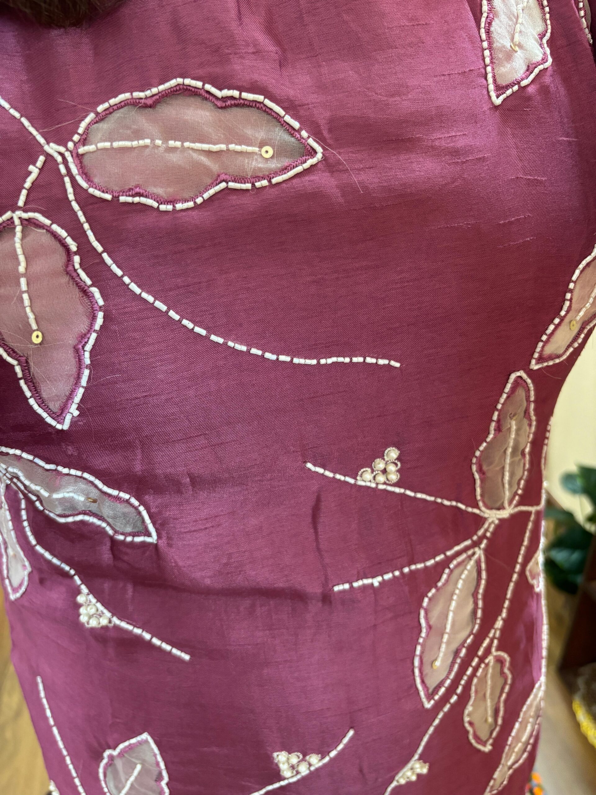 Kurta: Pure Premium Silk Fabric with Pearl & Thread Leafs Pattern Handwork all Over, with Mal Cotton lining attached.