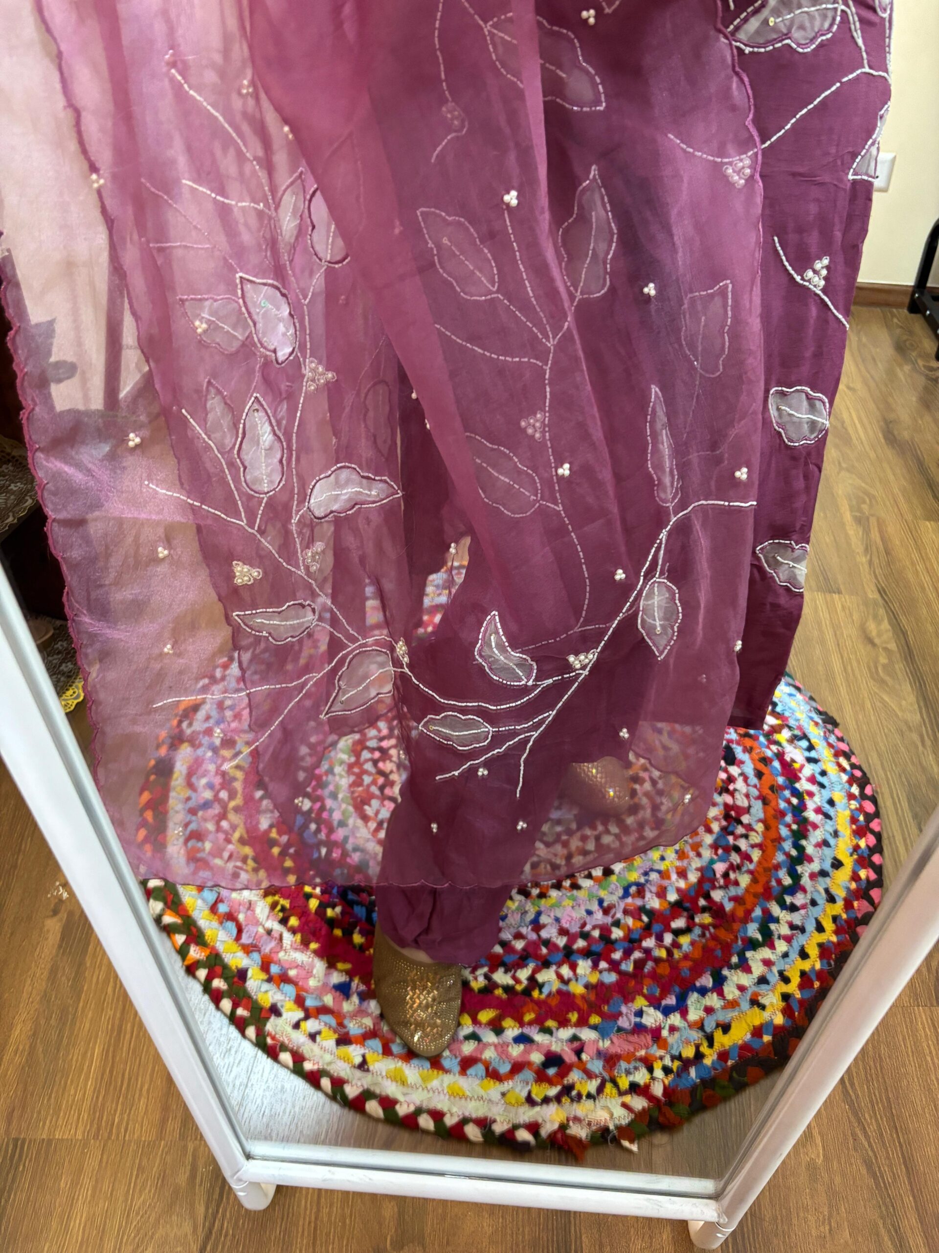 Dupatta: Pure Organza with Thread & Pearl Leafs Pattern detailing on Dupatta.