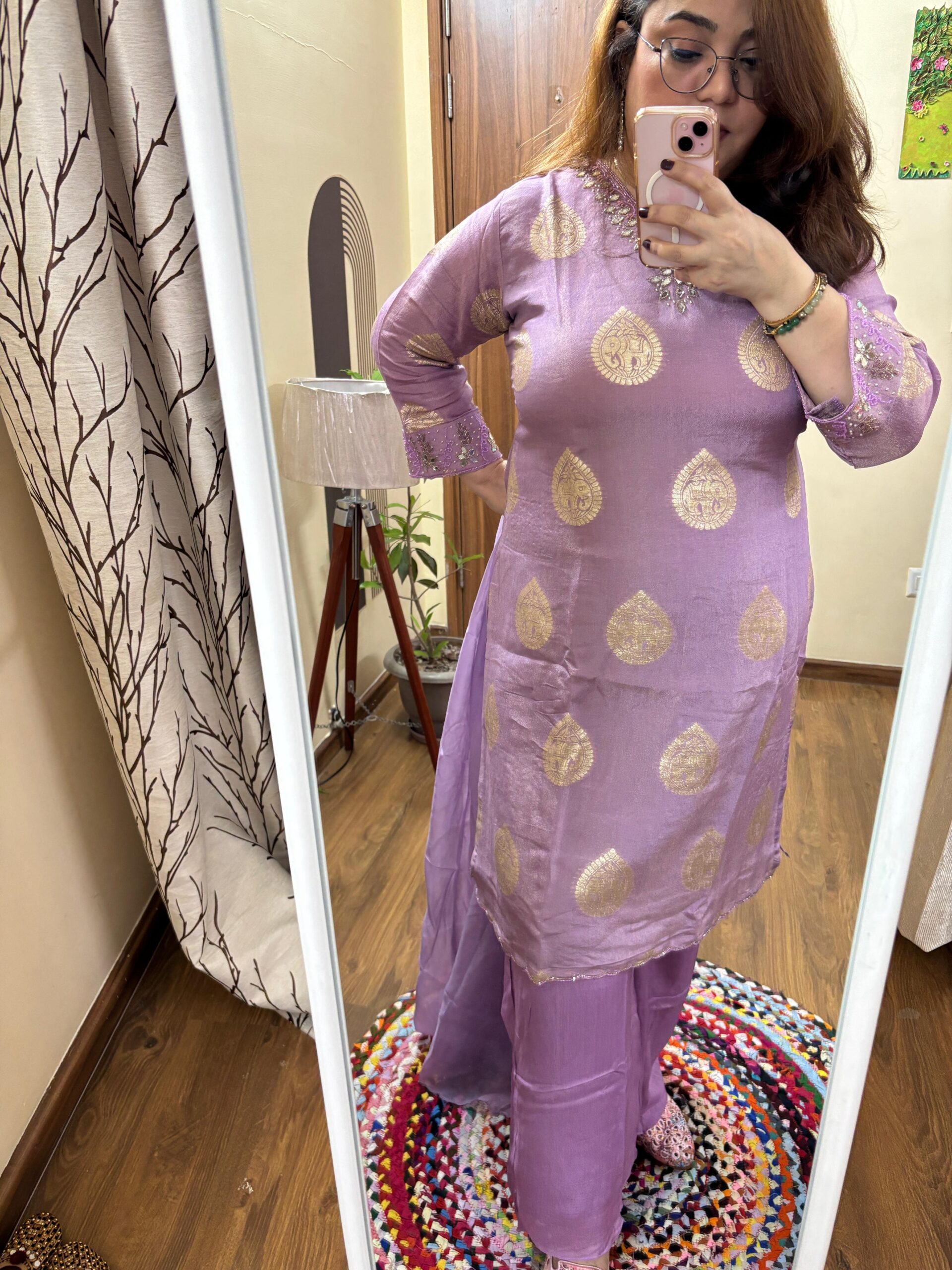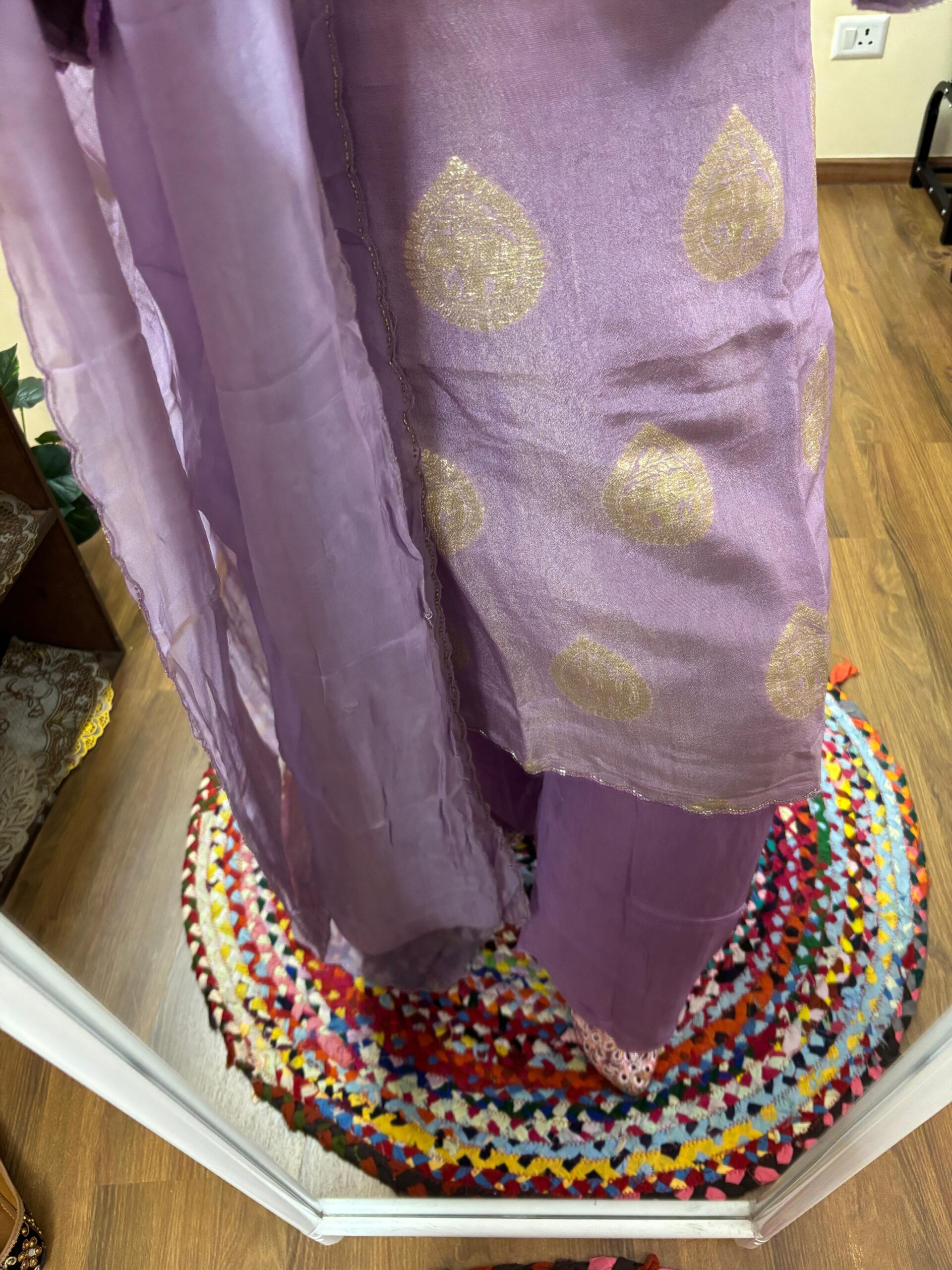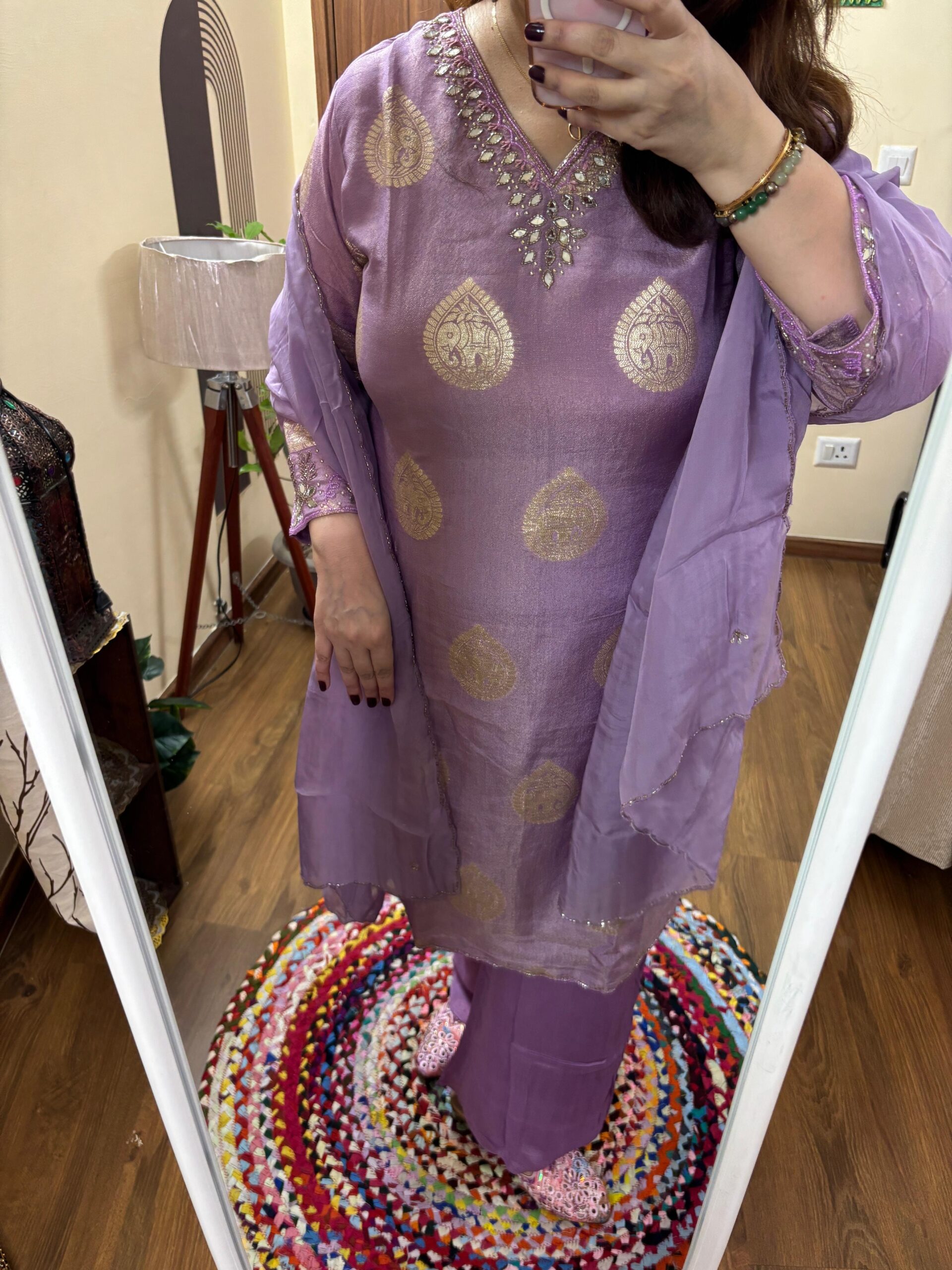 Kurta: Pure Premium Shimmer Silk Weaving with Original Mirror and Katdana Handwork on Neck & sleeves. Kurta will come with Mal Cotton Lining attached.