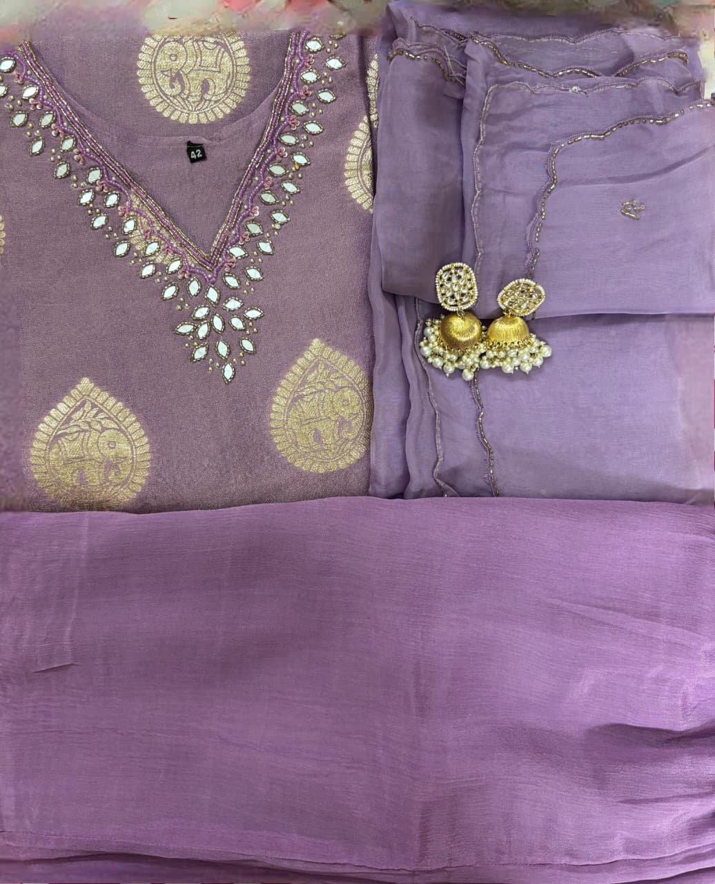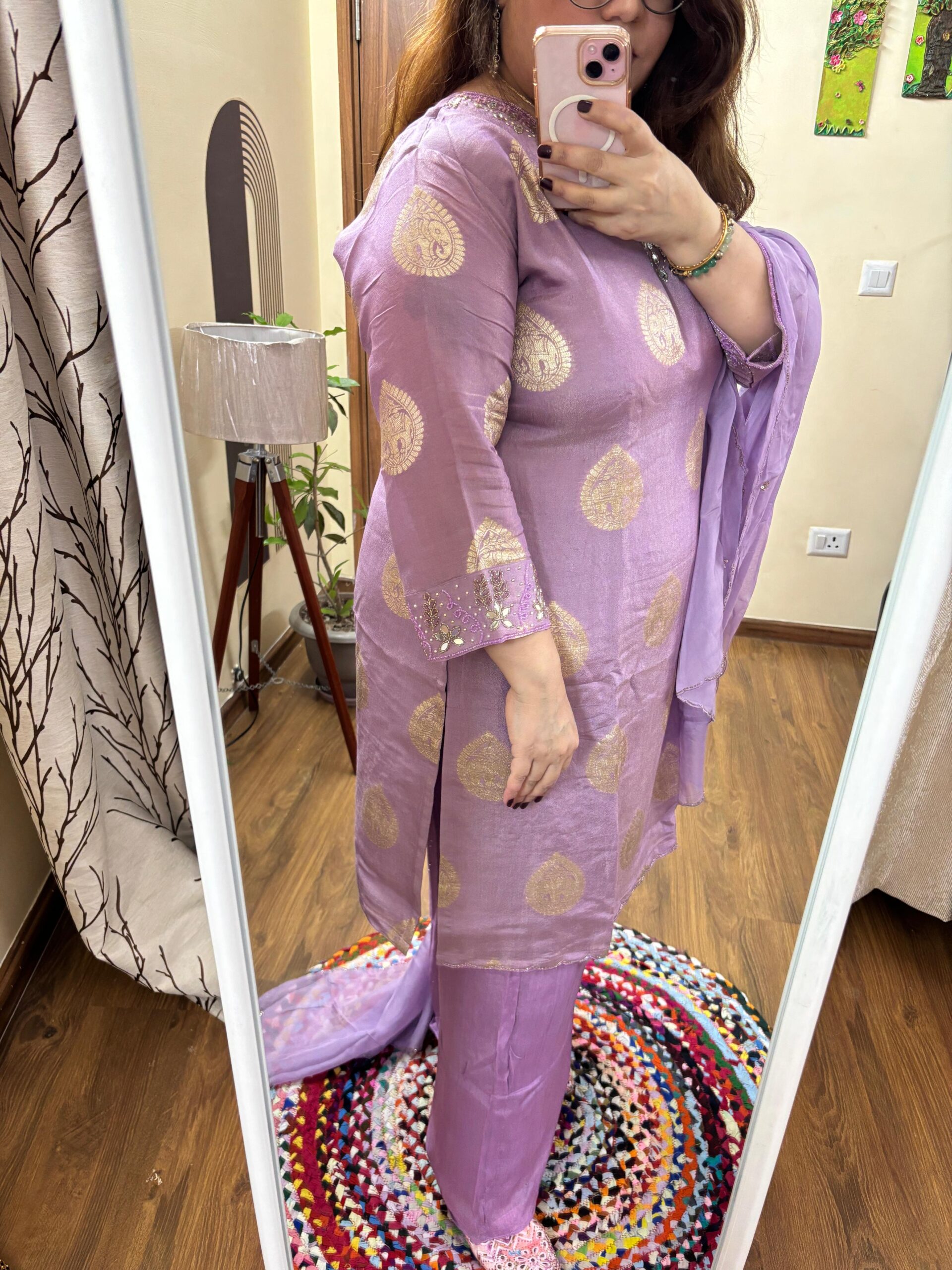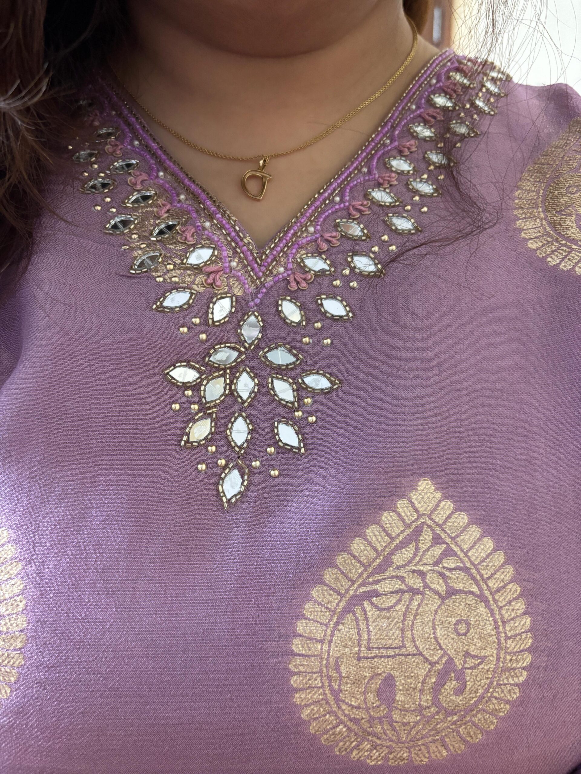 Kurta: Pure Premium Shimmer Silk Weaving with Original Mirror and Katdana Handwork on Neck & sleeves. Kurta will come with Mal Cotton Lining attached.