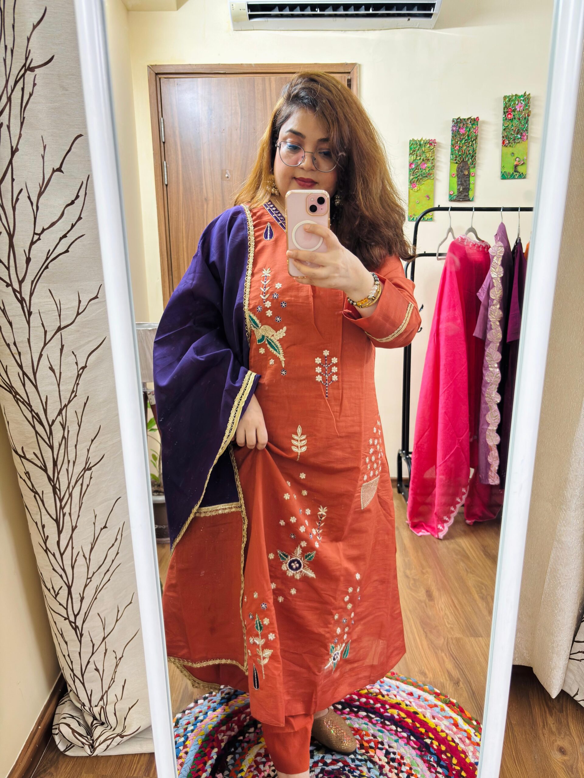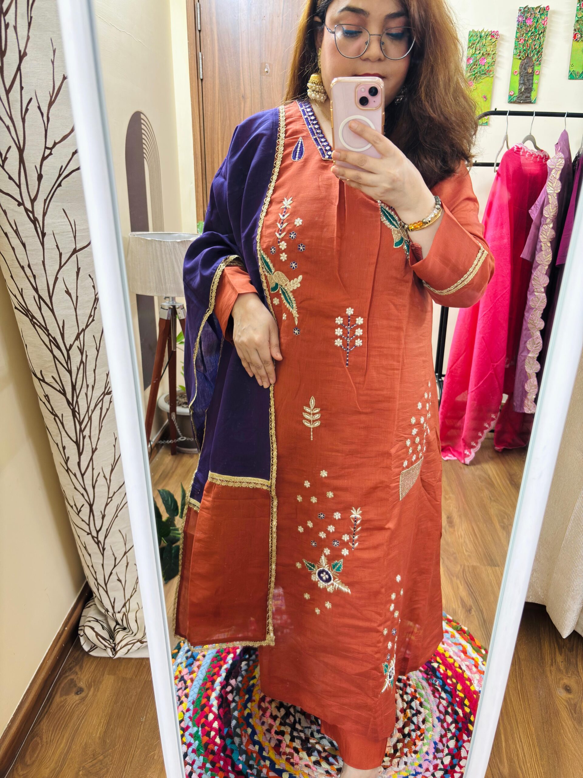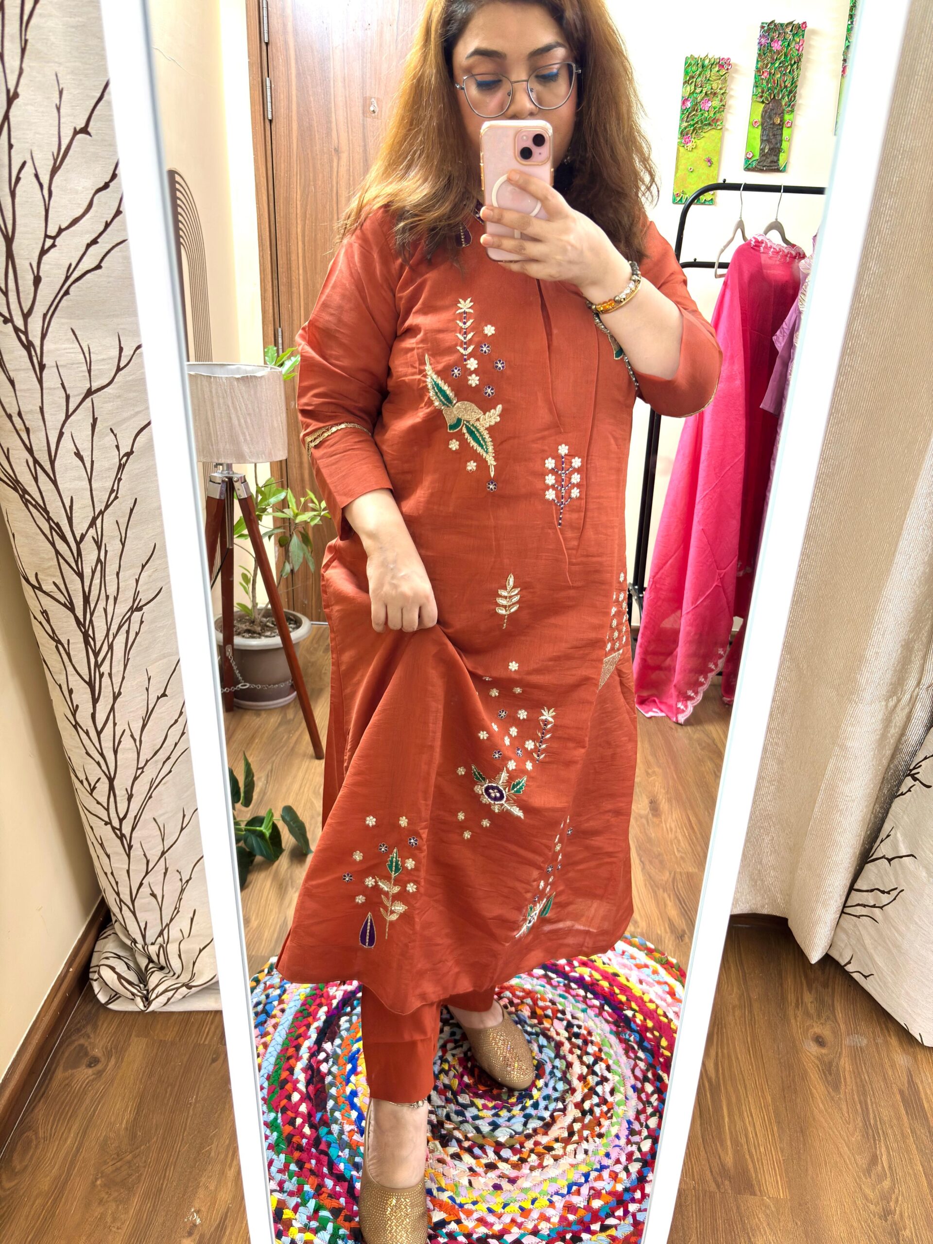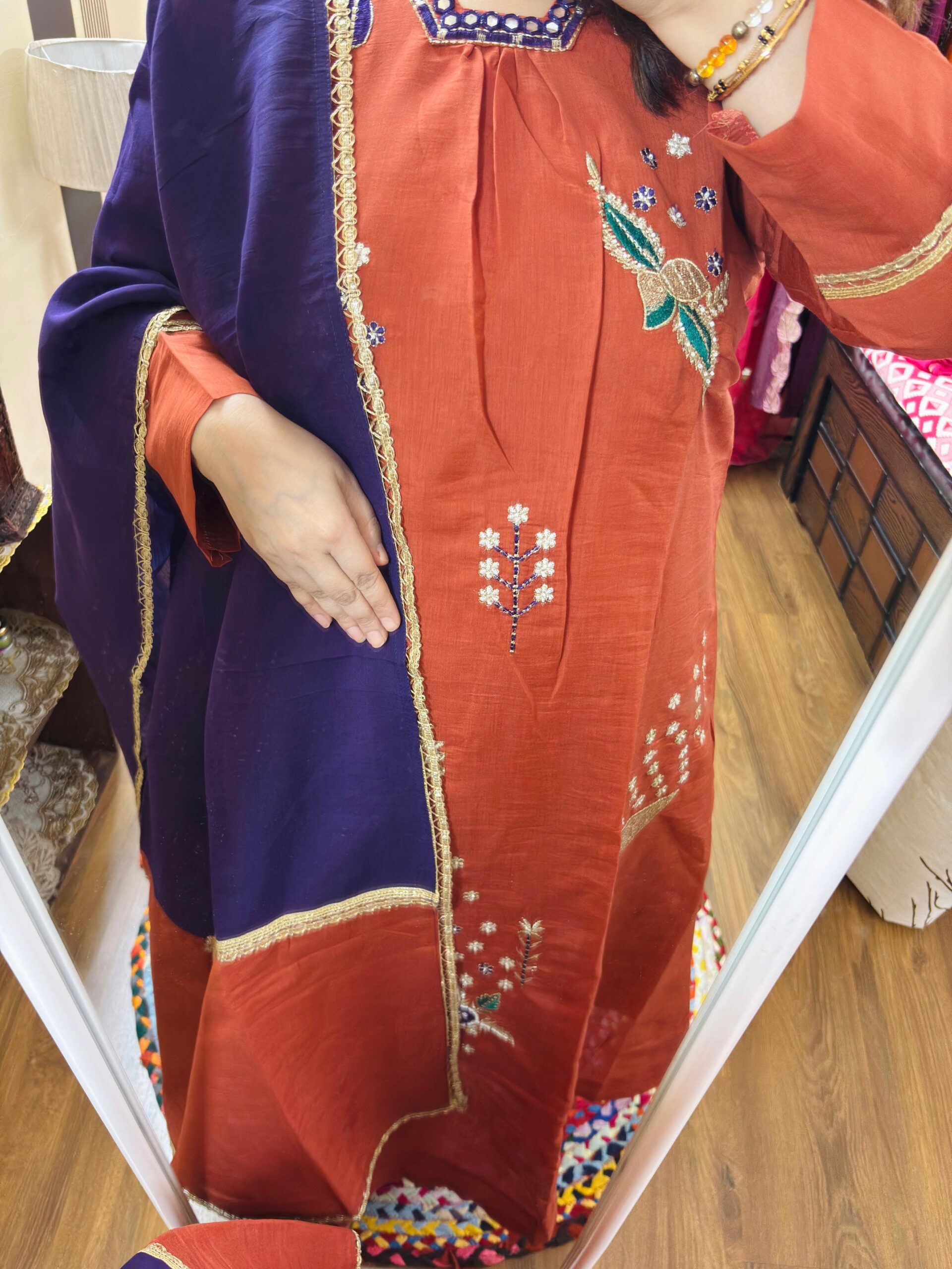 Kurta Dupatta Set – Ethnicwear -Rust Orange Color – Mal Chanderi Fabric with Mal Cotton lining attached and Handcrafted of Resham & Gotta lace Work All over.