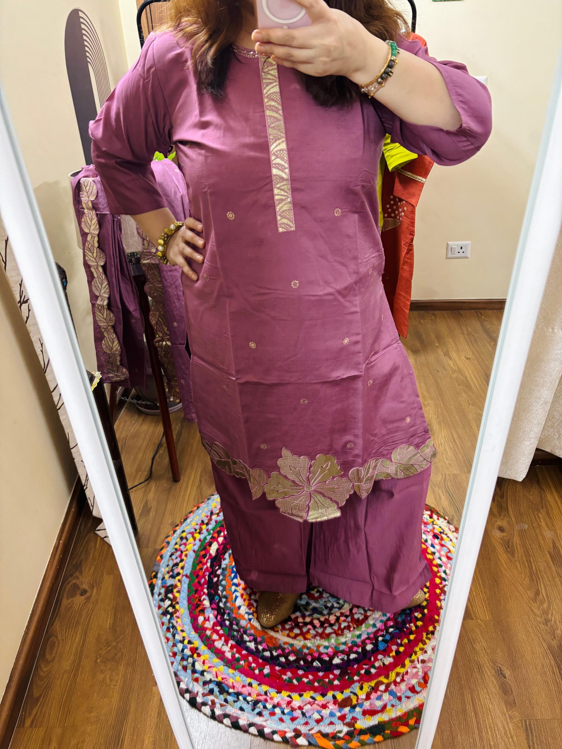 Kurta: Pure Roman Silk Fabric with Mal Cotton Lining attached and with leather flower work and sequence detailing.