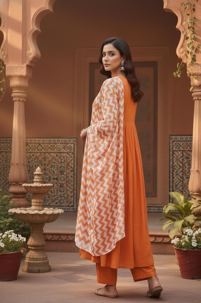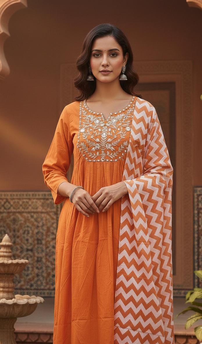 Women ethnic Set – Orange Color thread Embroidery work Gathered Pattern Cotton Kurta Pant & Dupatta set.