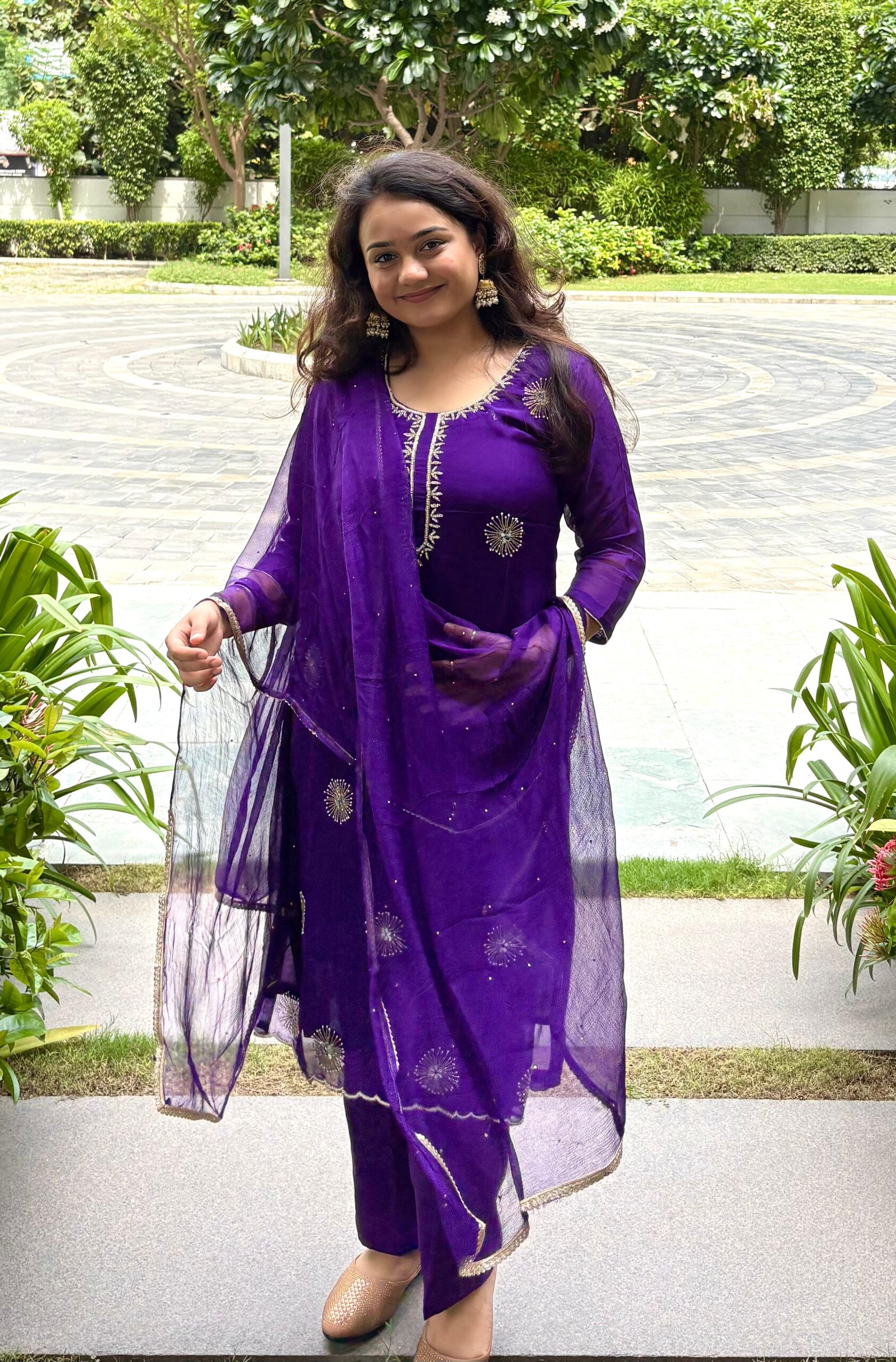 Mul Chanderi Fabric-Hot Pink-Handwork 3pcs Set