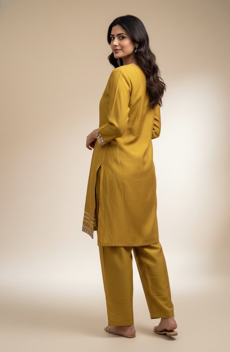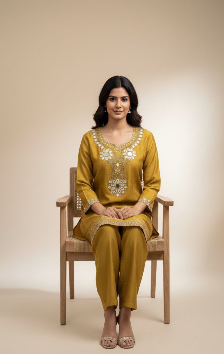 Elevate your ethnic style with this Roman Silk Mirror Work Co-ord Set, featuring a beautifully embroidered kurta with intricate mirror work on the neckline and hem. Paired with matching straight pants, this elegant outfit offers a perfect blend of comfort and traditional charm, making it ideal for festive and special occasions.