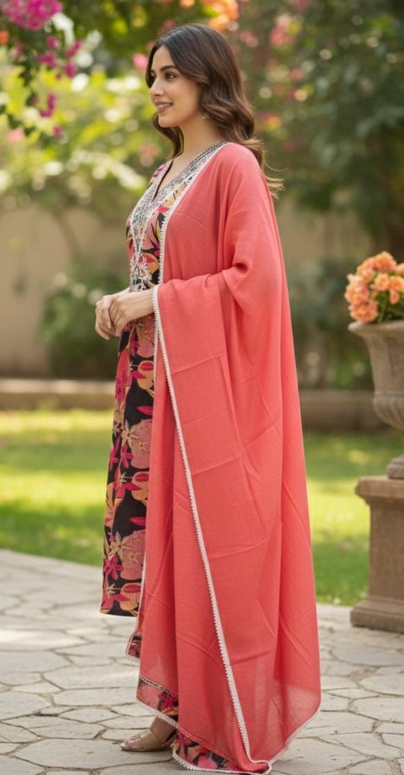 Kurta: Soft Tebby Cotton with mal Cotton lining attached big floral self-digital printed Kurta with sequence, Thread and pearl heavy handwork on Neck.