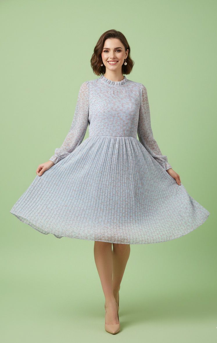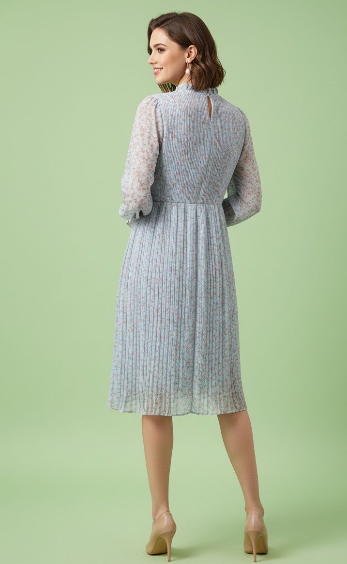 Add a touch of feminine elegance to your wardrobe with this stunning chiffon floral print dress. Crafted from lightweight chiffon fabric with a soft inner lining, this dress ensures both comfort and graceful movement. Featuring delicate all-over floral prints, a high ruffle neckline, and finely pleated detailing, it offers a chic and sophisticated look. The flowy A-line silhouette paired with stylish ruffle sleeves enhances its charm, making it perfect for both casual and dressy occasions.