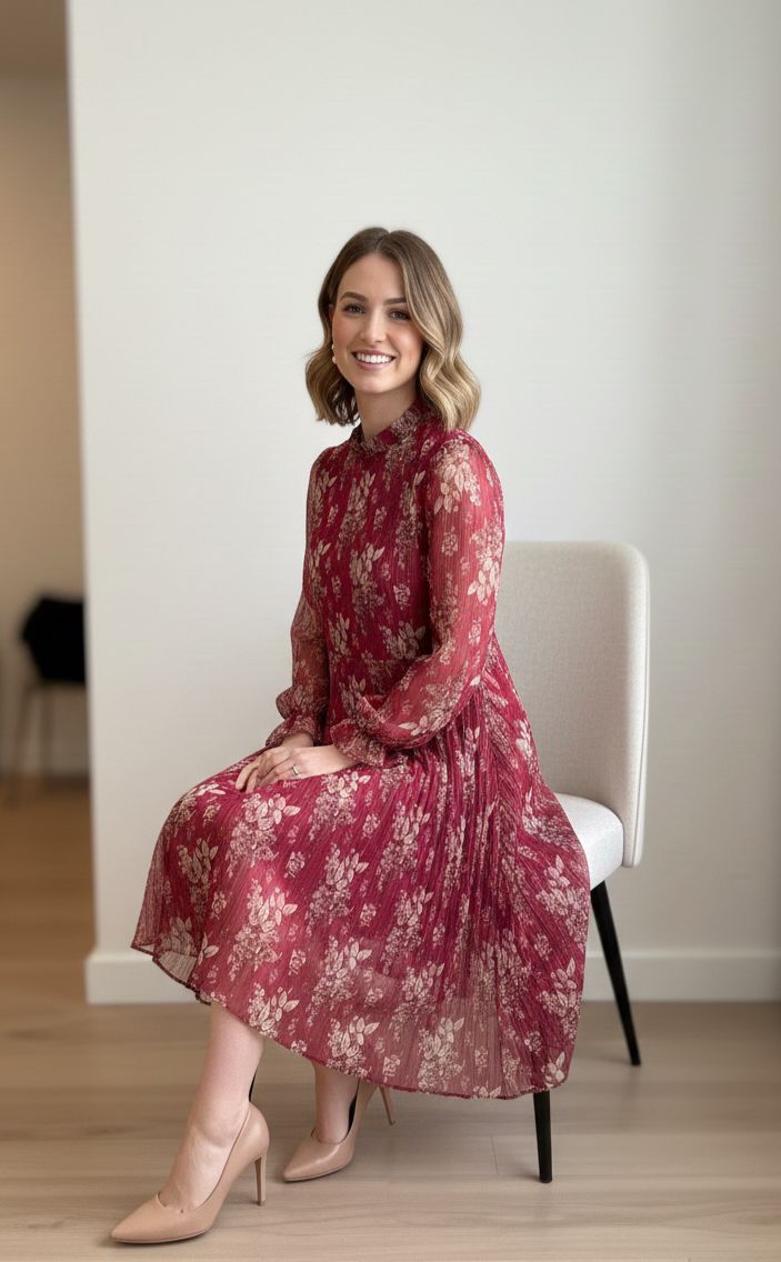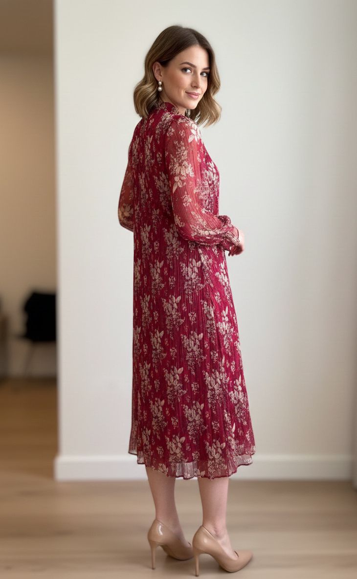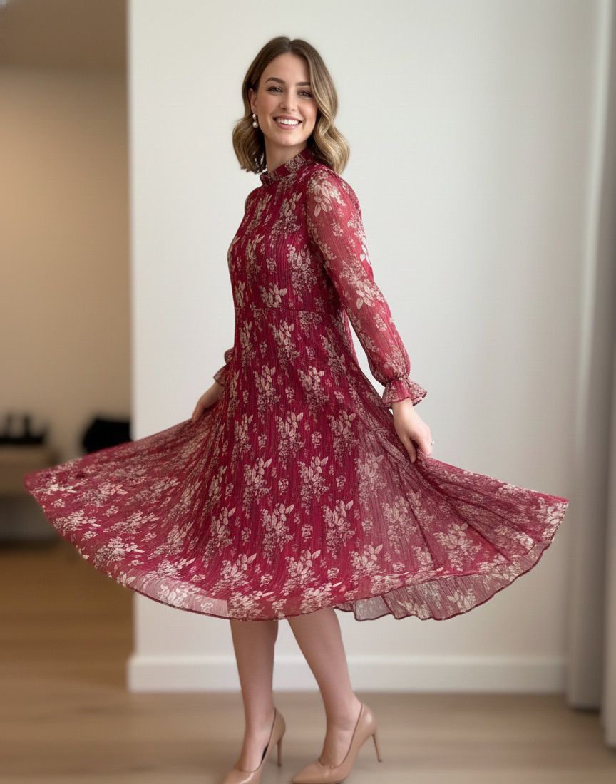 Add a touch of feminine elegance to your wardrobe with this stunning chiffon floral print dress. Crafted from lightweight chiffon fabric with a soft inner lining, this dress ensures both comfort and graceful movement. Featuring delicate all-over floral prints, a high ruffle neckline, and finely pleated detailing, it offers a chic and sophisticated look. The flowy A-line silhouette paired with stylish ruffle sleeves enhances its charm, making it perfect for both casual and dressy occasions.