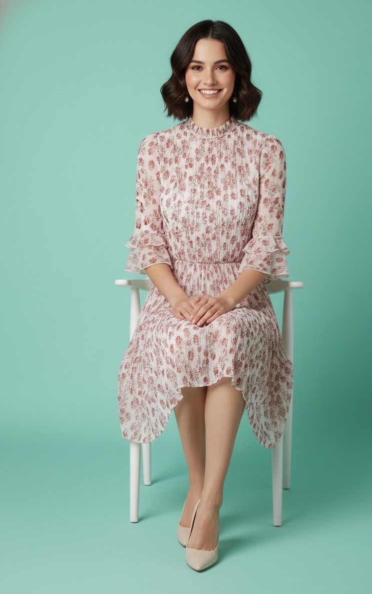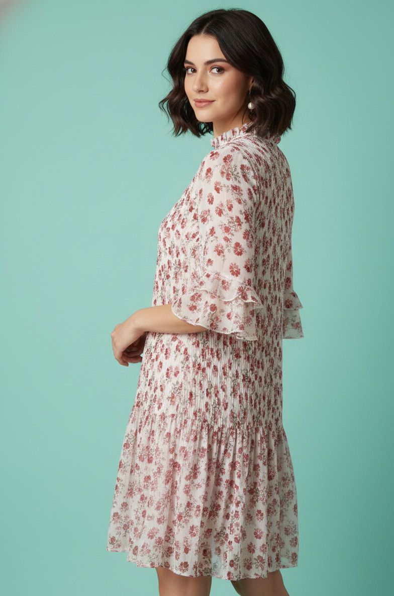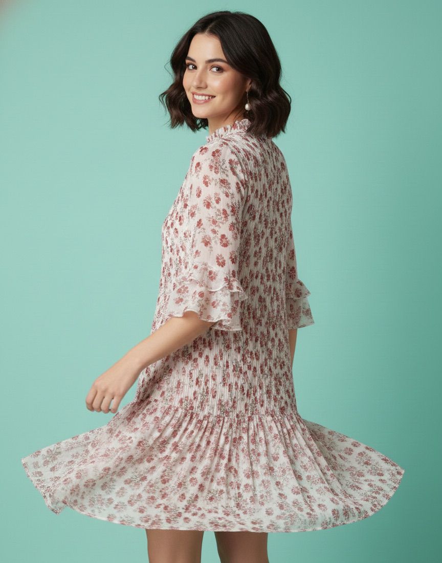 Women’s Chiffon White base with Floral Print Dress with Lining | Elegant Pleated A-Line Mini Dress with Ruffle Sleeves | Lightweight Party & Summer Wear