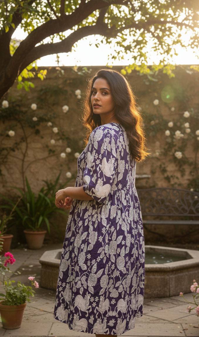Elevate your everyday style with this elegant cotton floral print dress, designed for comfort and effortless charm. Crafted from breathable cotton fabric, this Purple Floral Print dress features a relaxed silhouette with subtle tier detailing, making it perfect for all-day wear. The classic round neckline with button placket and 3/4 sleeves adds a refined touch.