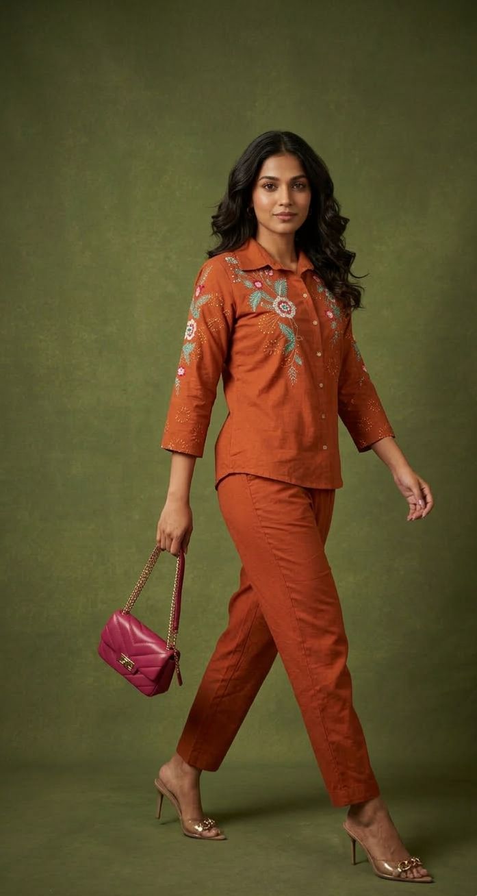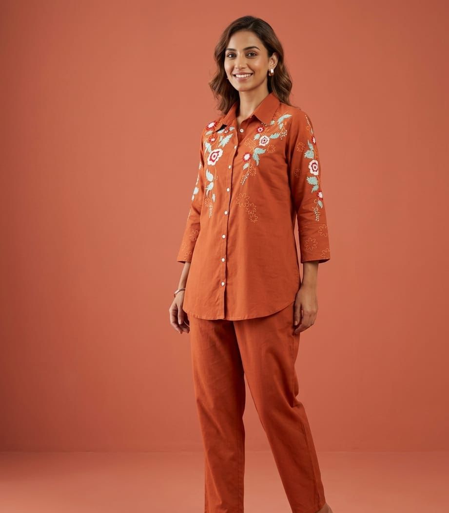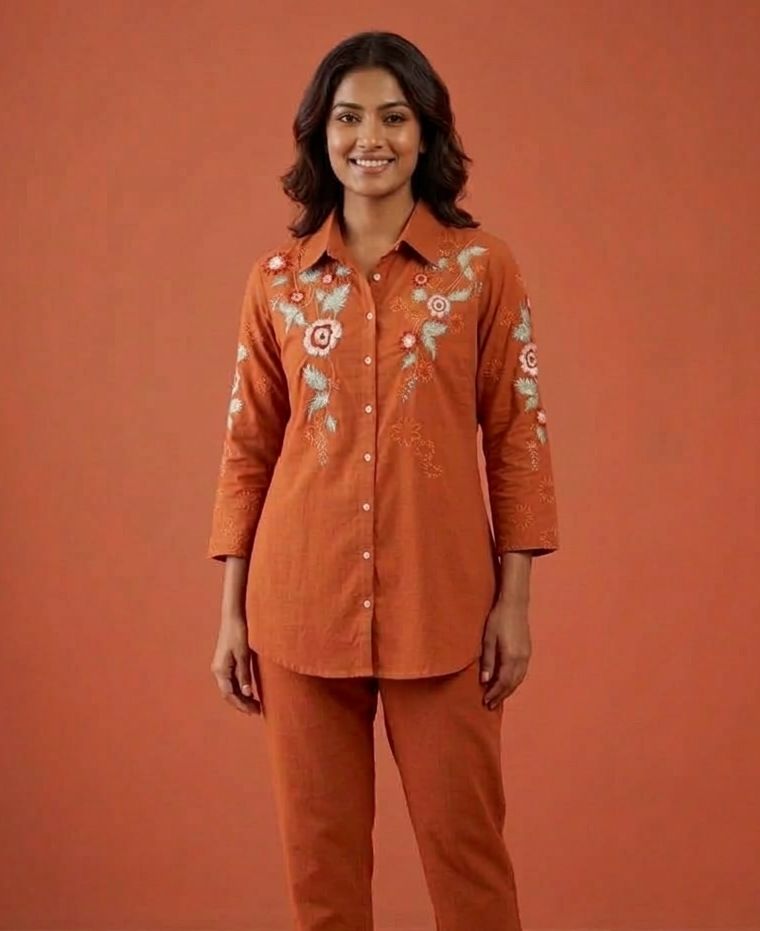 The rich orange tone combined with subtle embroidery creates a refined look that can easily transition from casual outings to semi-formal settings. Lightweight, comfortable, and stylish, this co-ord set is an ideal choice for women who love minimal yet elegant fashion.
