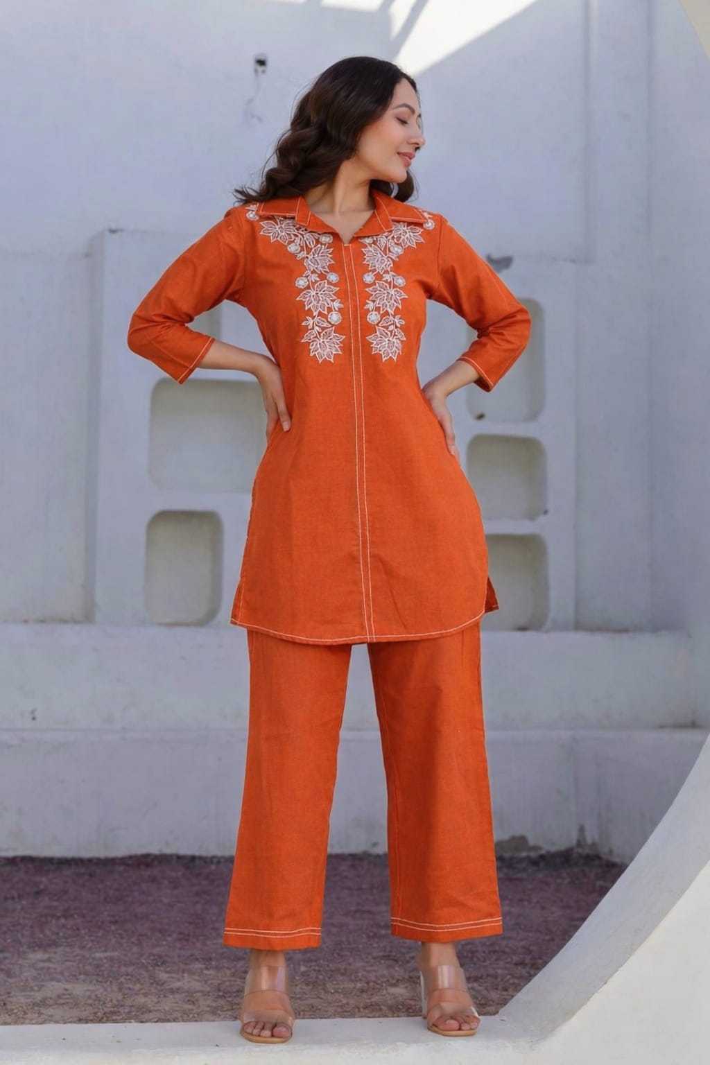 Women’s Cotton Embroidered Co-Ord Set – Stylish Cotton Collar shirt style Top with Straight Pants, Casual Ethnic Co-Ord Set for Women, Comfortable Daily Wear Outfit